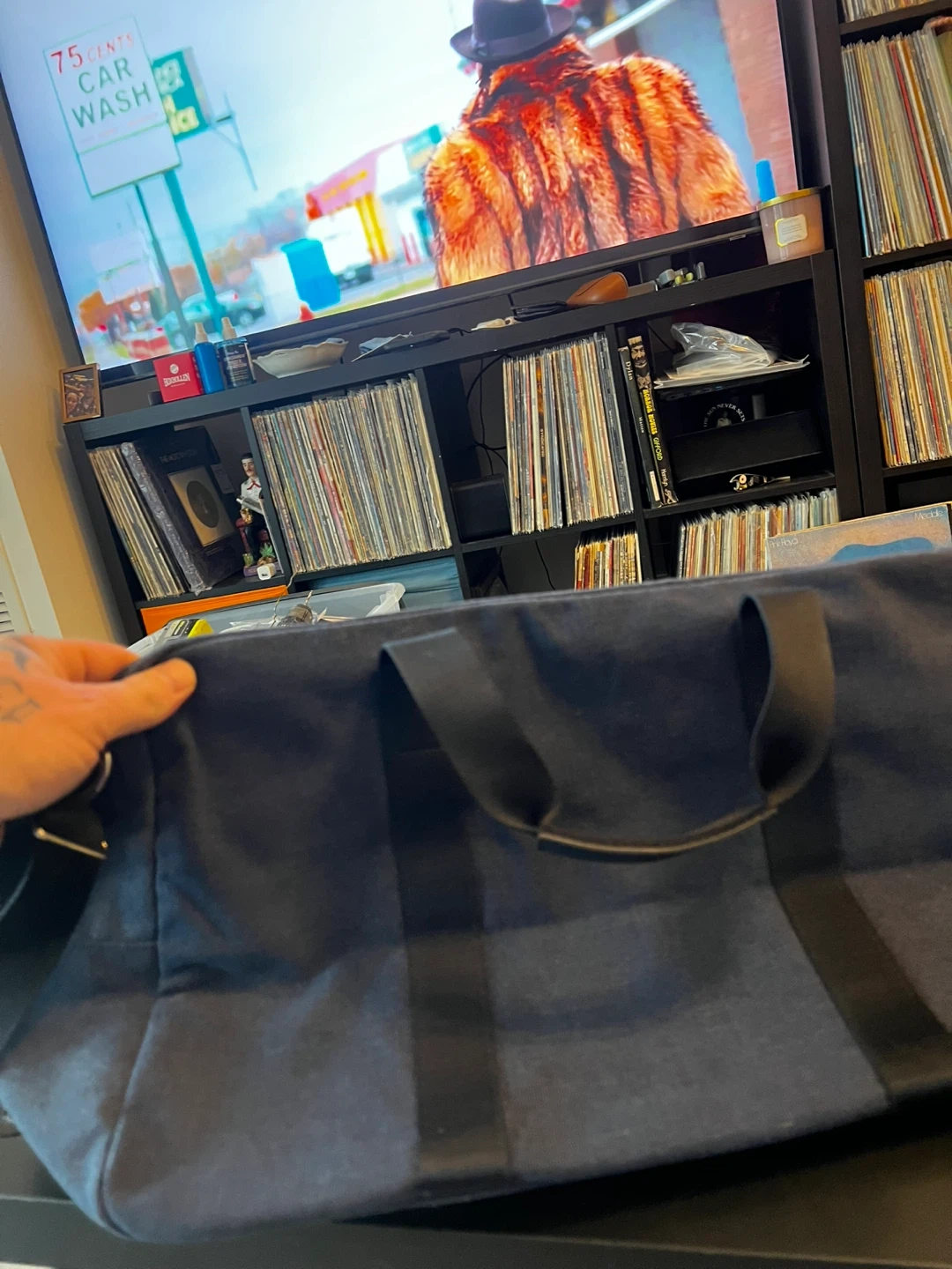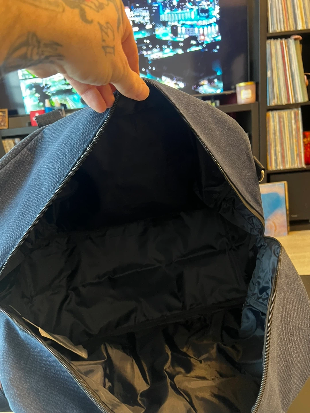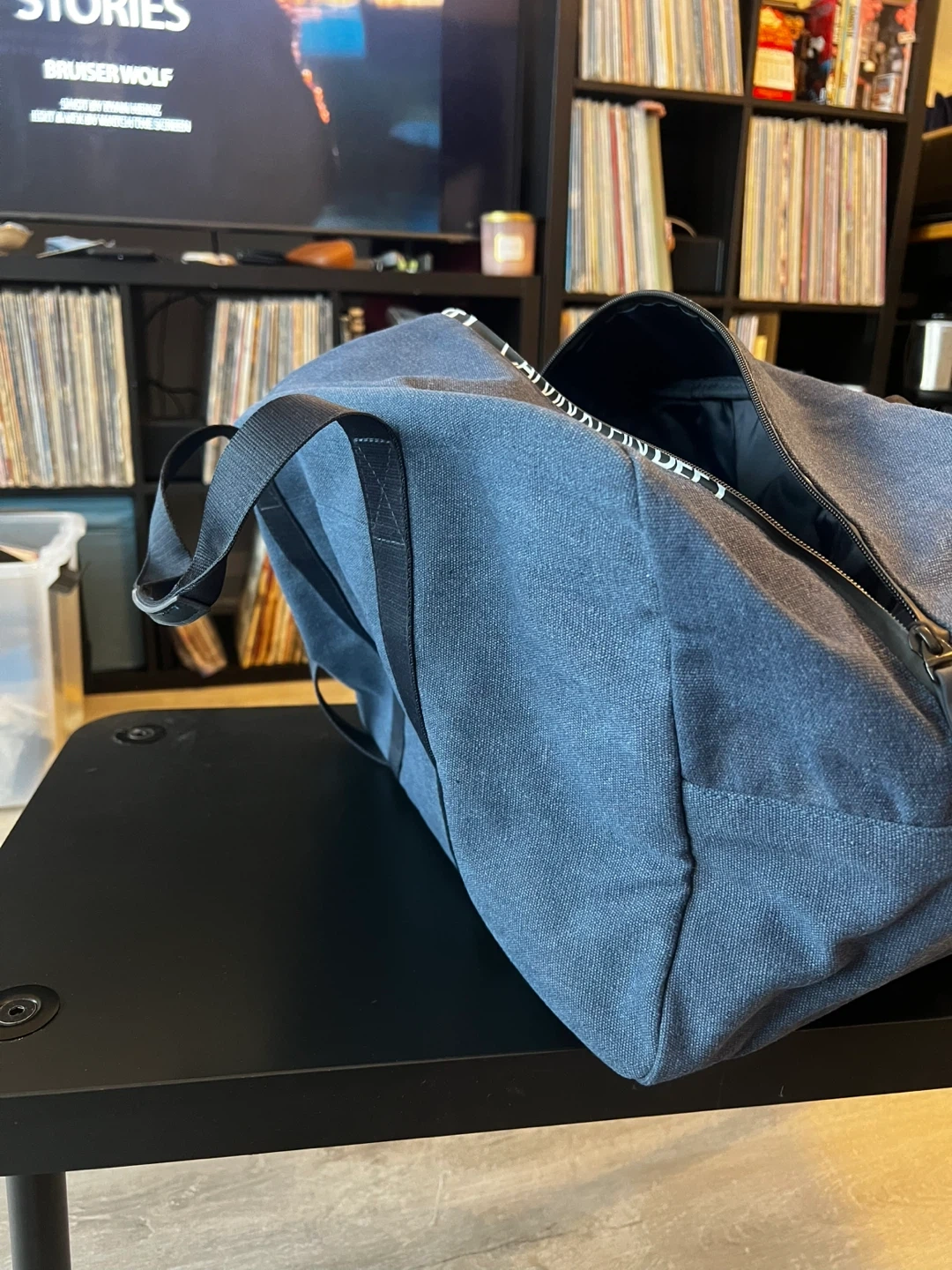 This is a Calvin Klein Defy duffle bag. It's dark blue with black handles and a detachable shoulder strap. There's also a tag attached that says 'YOUR GIFT' and 'CALVIN KLEIN DEFY EAU DE PARFUM'.