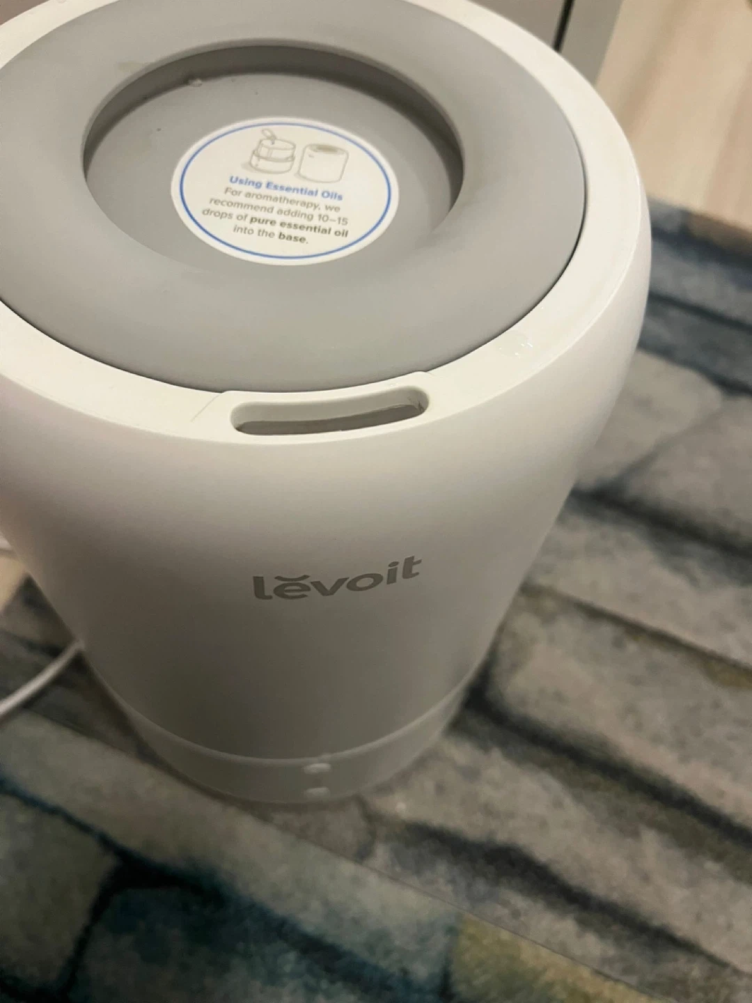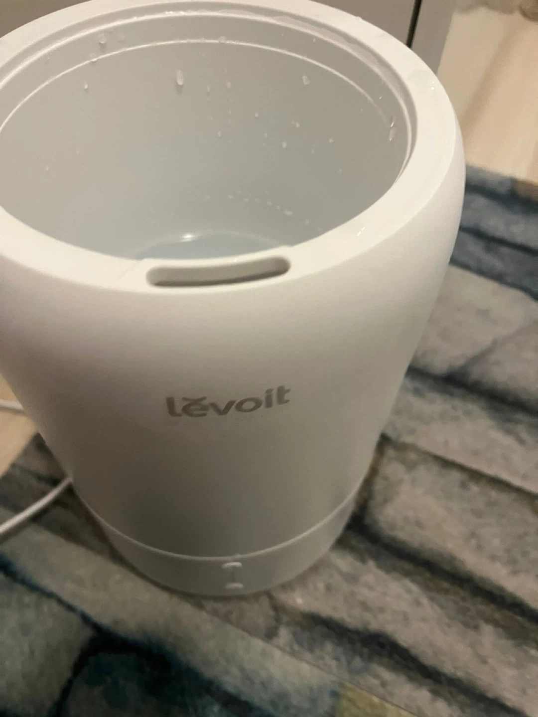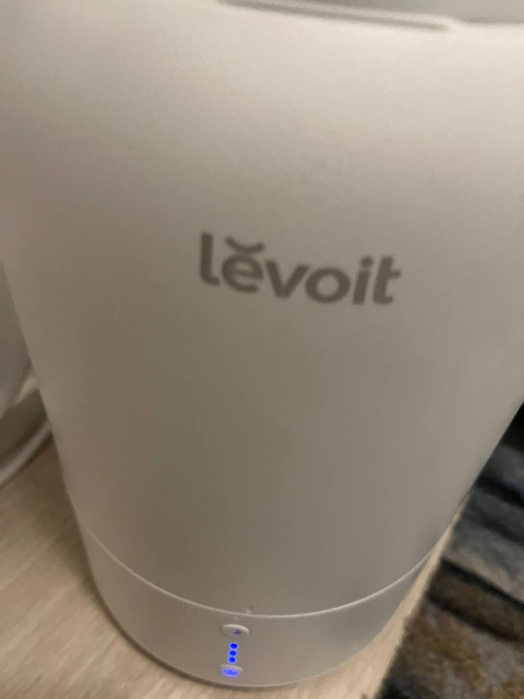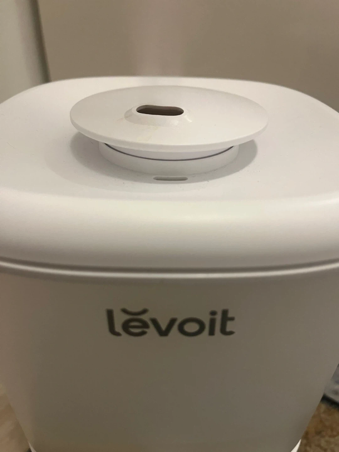 This Levoit humidifier is white. It has an adjustable knob for mist output. Use purified water and change water daily for best results. Clean water tank and base chamber every 3 days.