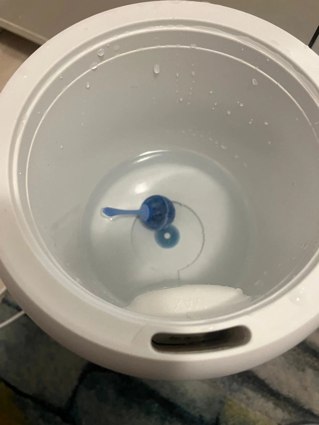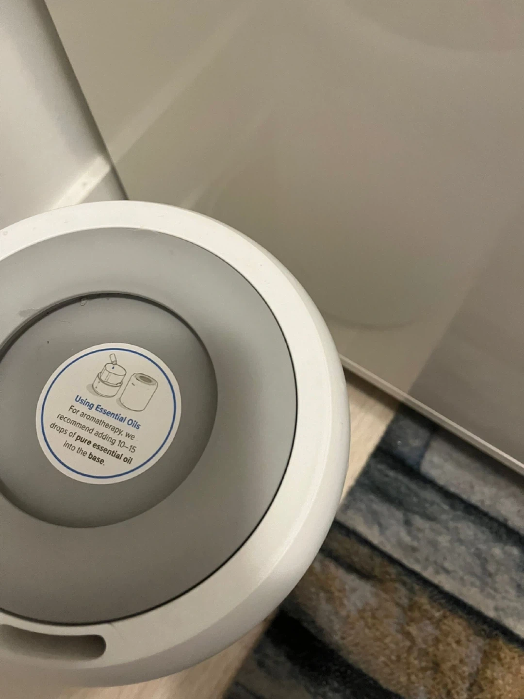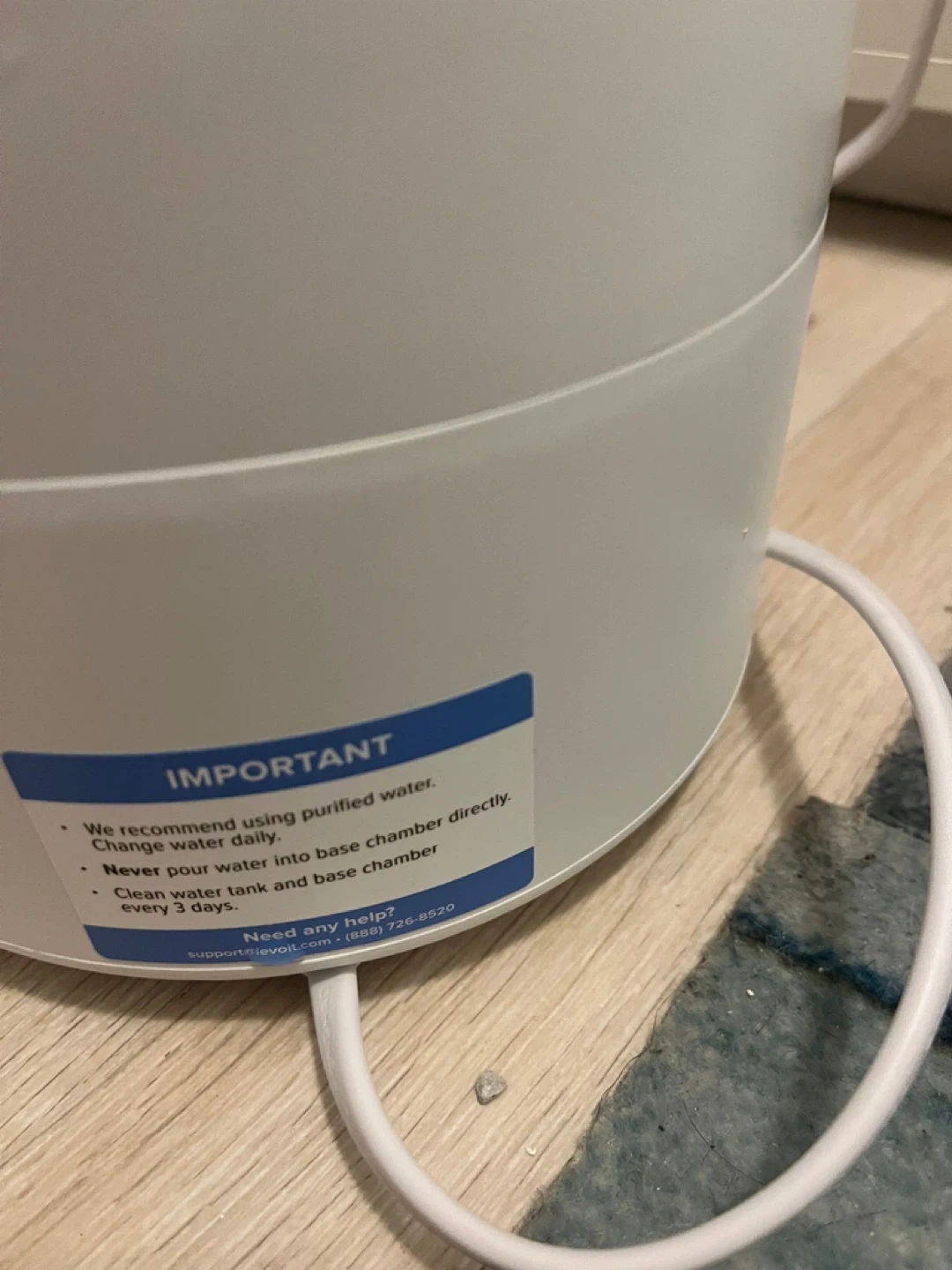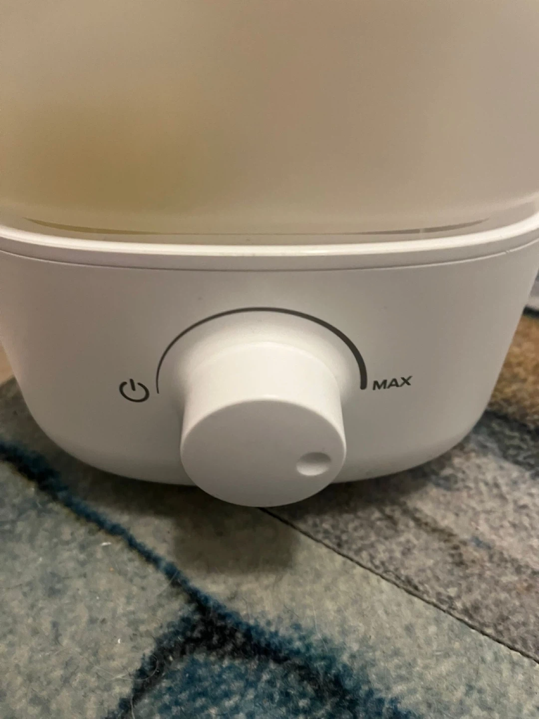 This Levoit humidifier is white. It has an adjustable knob for mist output. Use purified water and change water daily for best results. Clean water tank and base chamber every 3 days.