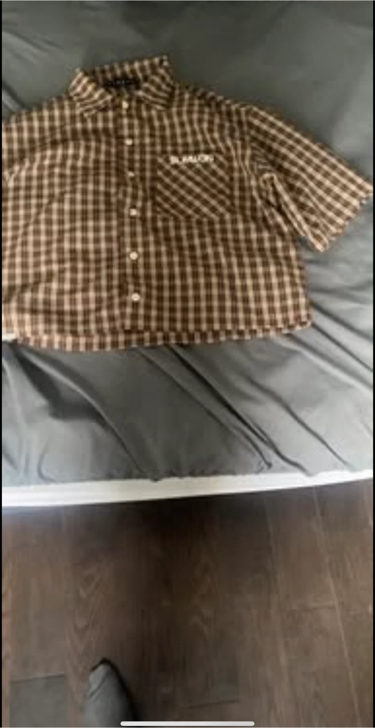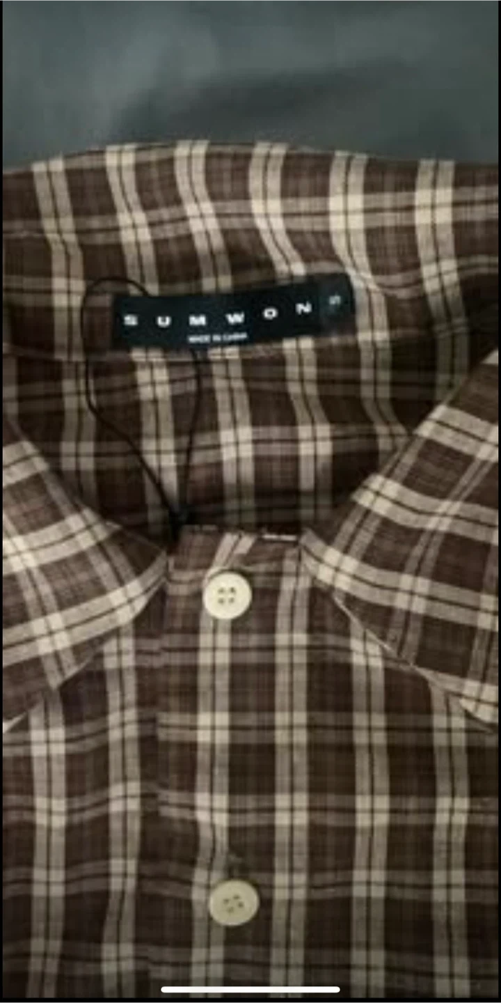 A plaid button-up shirt from Sumwon. It features a classic collar and button closure. The shirt is made of a checkered fabric.