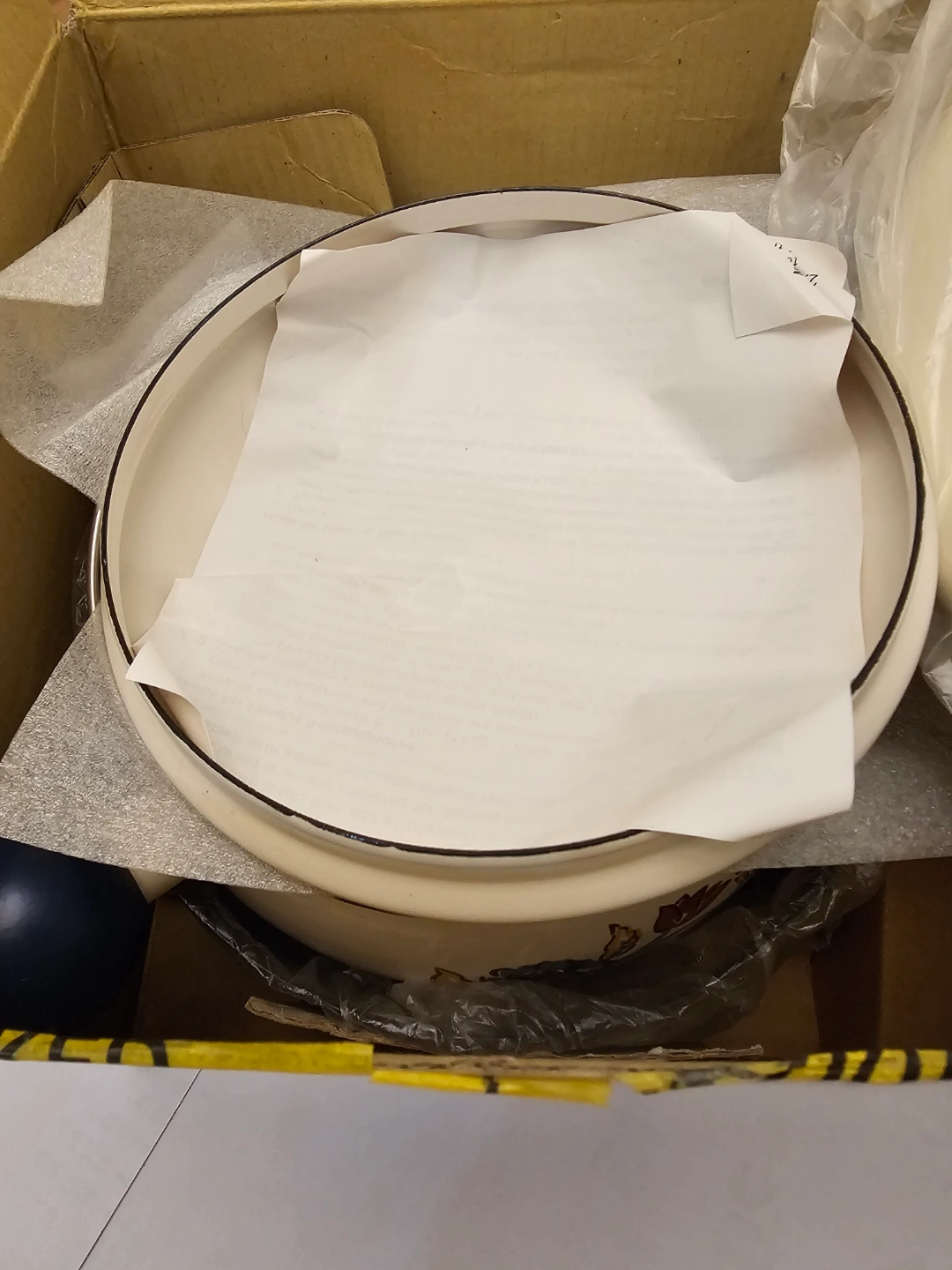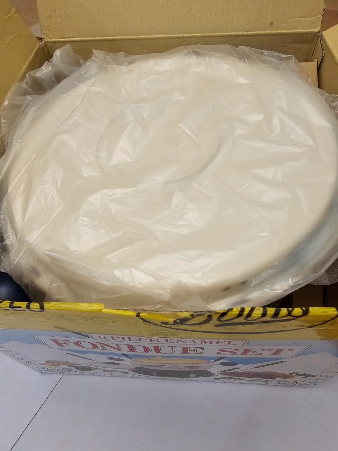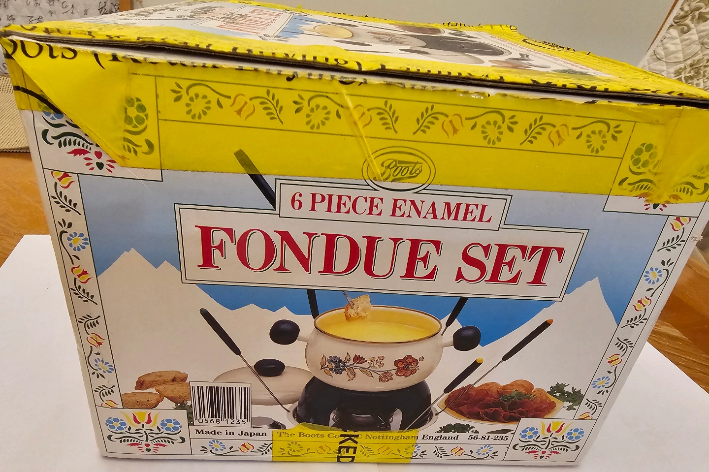 Six-piece enamel fondue set in original box. Made in Japan. Features floral design. Includes fondue pot, stand, and forks.