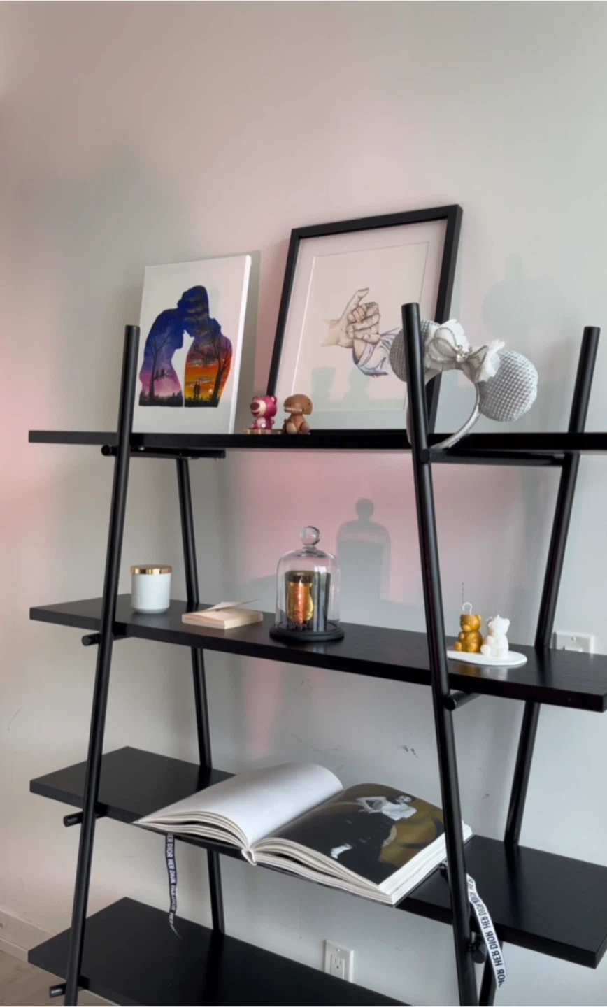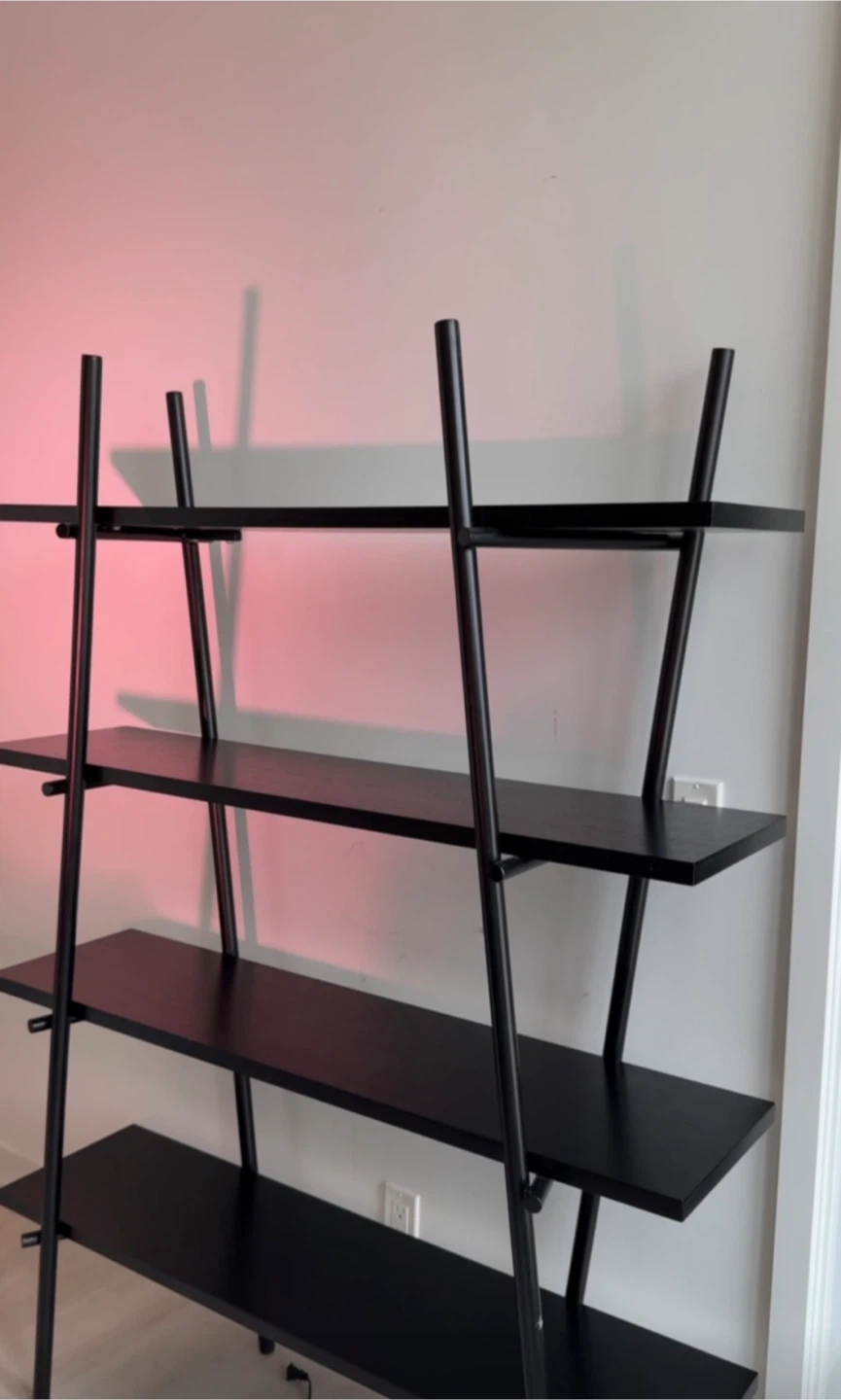 Sleek and modern black ladder-style shelf in great condition. Features a minimalist metal frame with multiple spacious shelves, perfect for styling books, plants, decor, or storage. Looks beautiful in a living room, bedroom, office, or studio space.