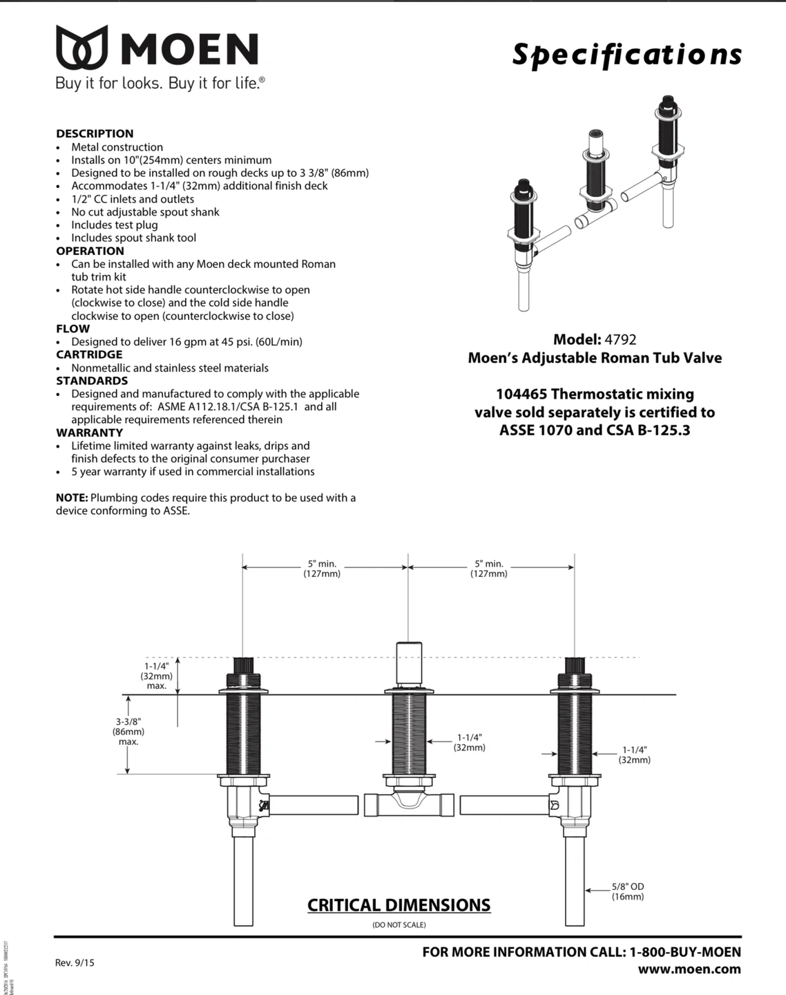 This is a Moen 4792 adjustable Roman tub valve. It's made of brass and stainless steel. It's designed to deliver 16 gpm at 45 psi.