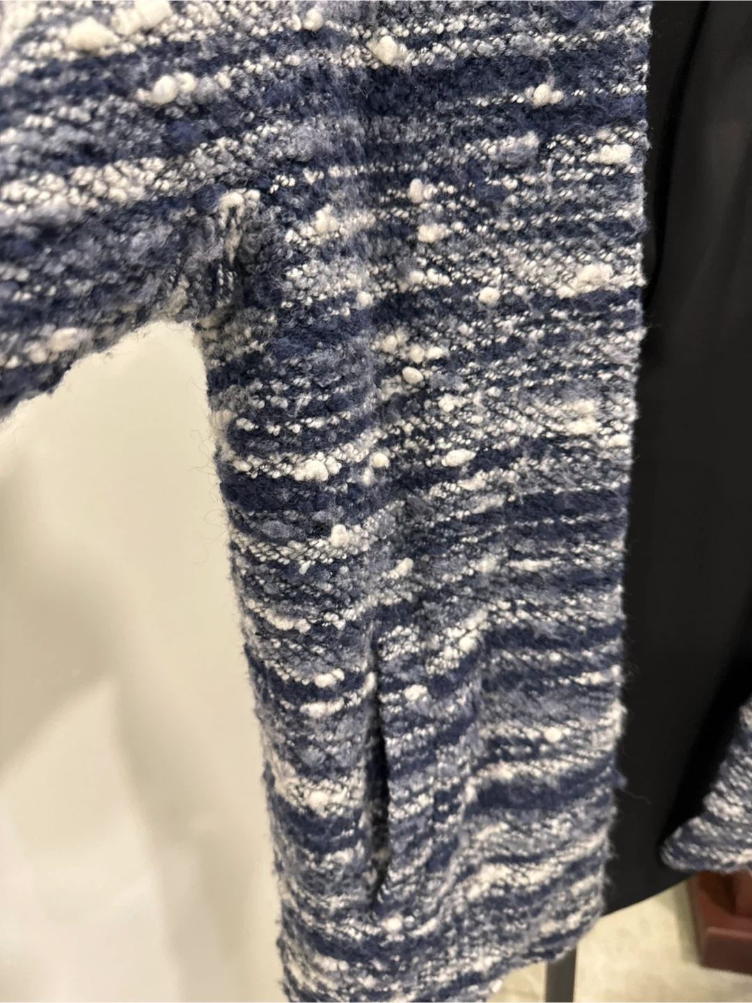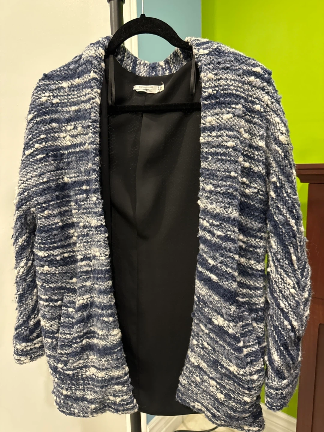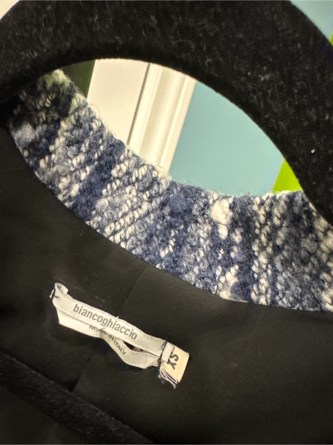 Selling a Biancoghiaccio women's jacket in size XS! It's a stylish piece with a unique textured design in blue and white. The inner lining is black. Perfect for adding a touch of elegance to any outfit!