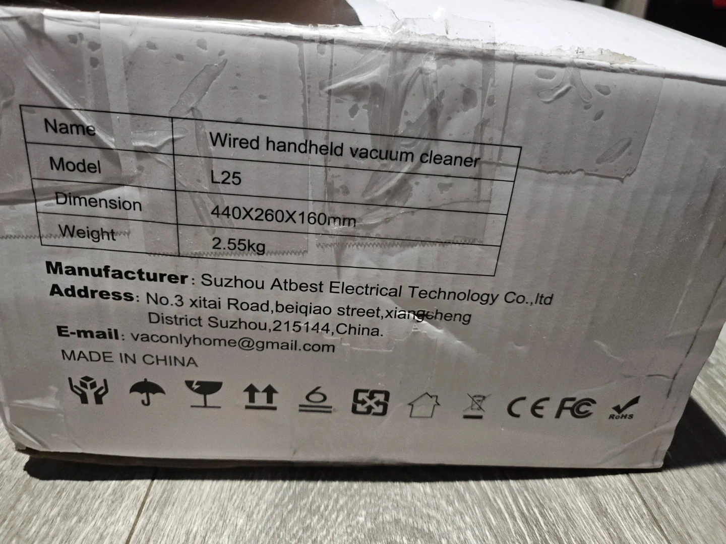 This is a wired handheld vacuum cleaner, model L25. It has dimensions of 440x260x160mm and weighs 2.55kg. The item includes the vacuum unit, various attachments, and the original box. It's perfect for quick cleanups around the house!