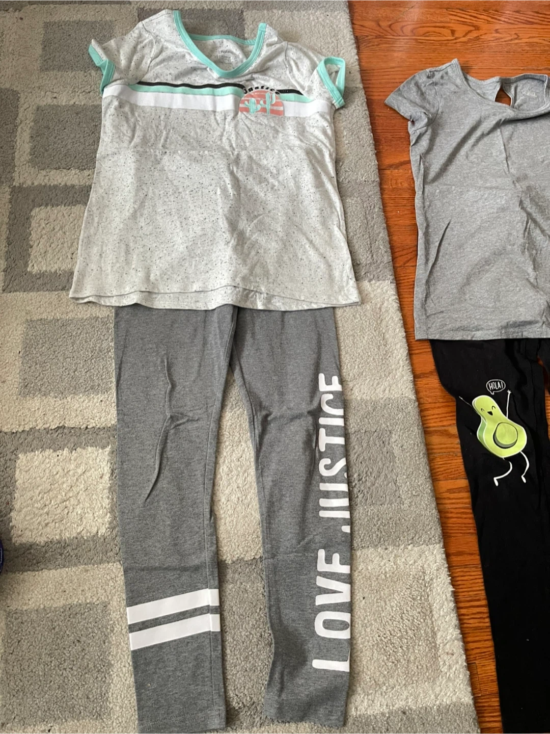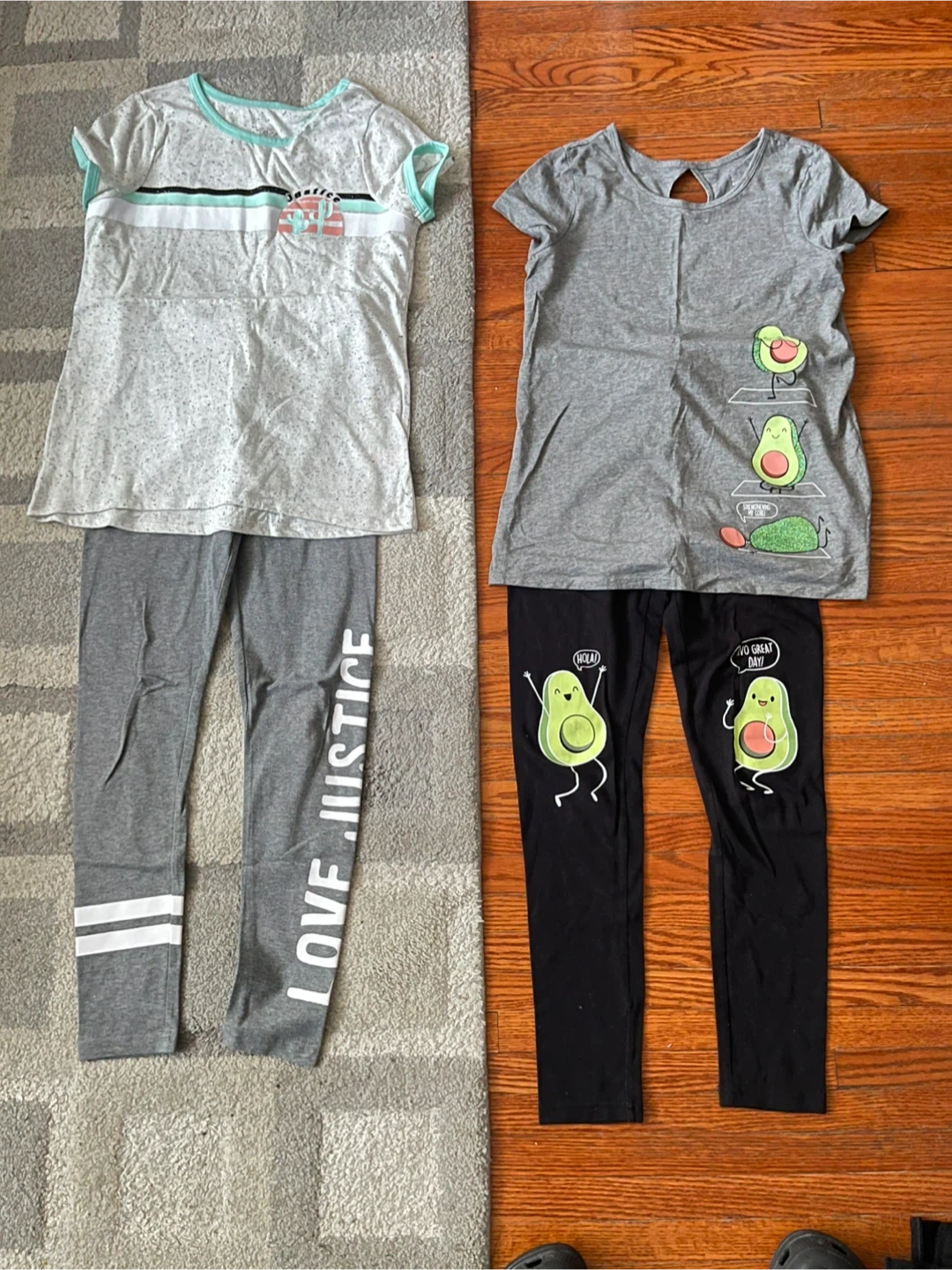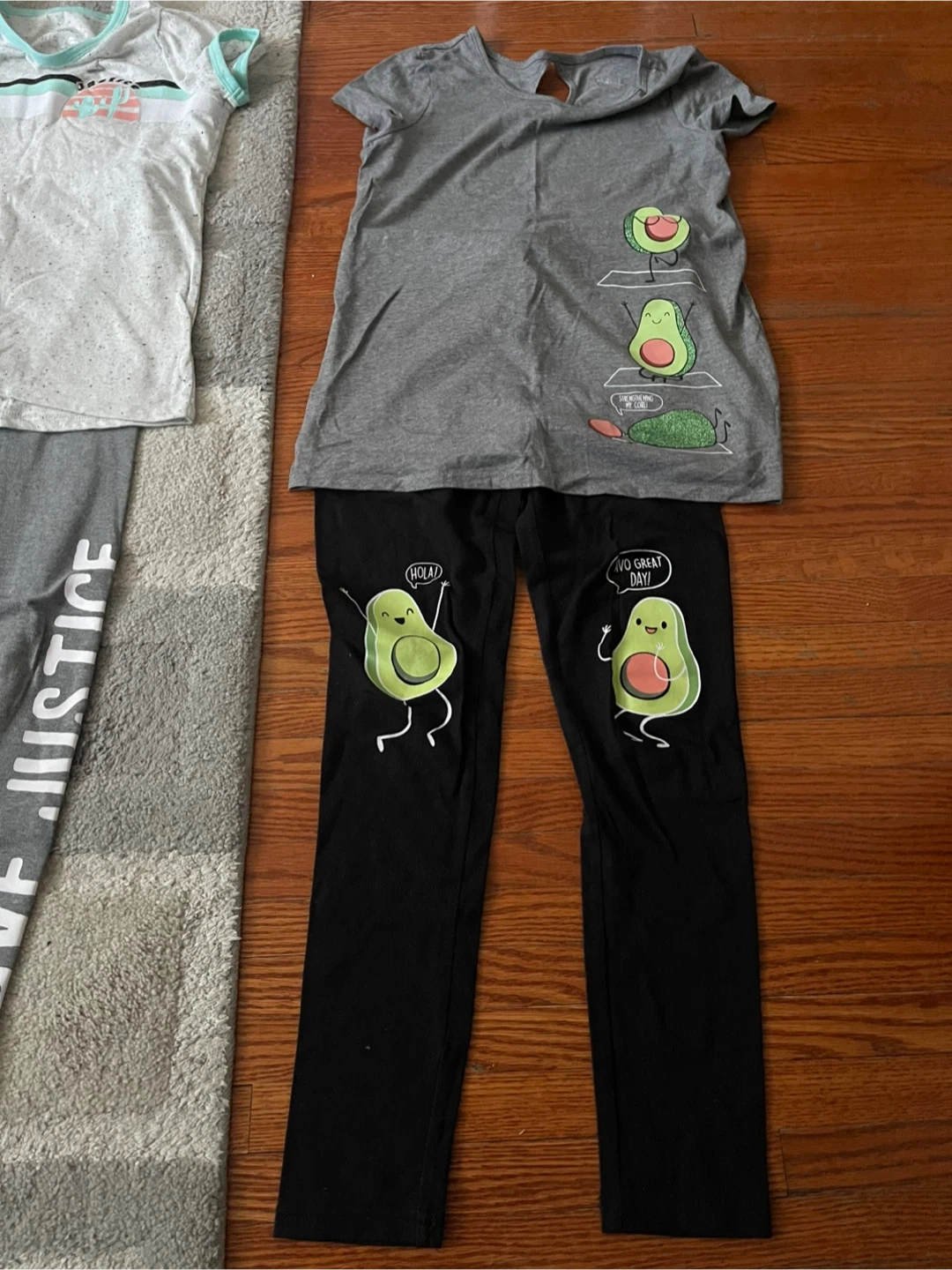 This is a girls' size 12 t-shirt and pants set from Justice. The grey t-shirt features avocado graphics with "Hola!" and "Yo! Great Day!" speech bubbles. The grey leggings have "LOVE JUSTICE" printed down the leg. Both pieces are made of soft, stretchy material for comfort.