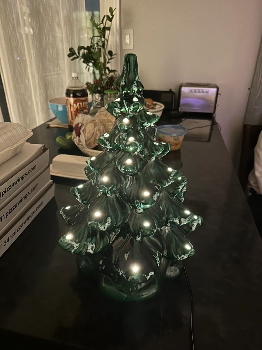 ceramic light-up Christmas tree, approximately 17 inches tall.