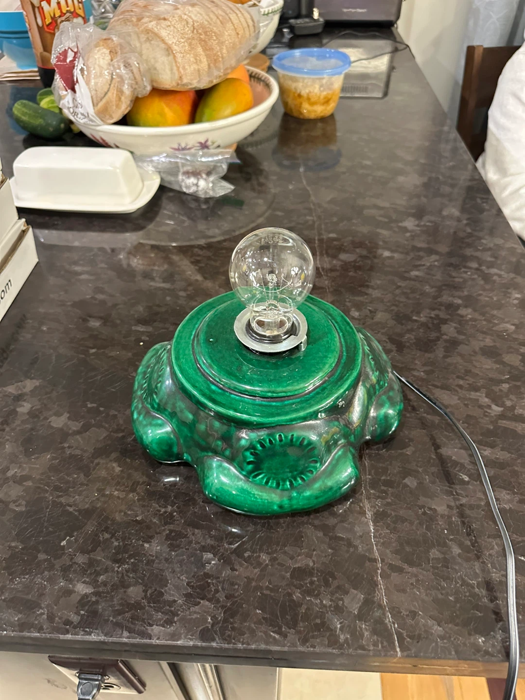 Features a rich green glazed finish with molded branch details and internal lighting that glows warmly when plugged in.