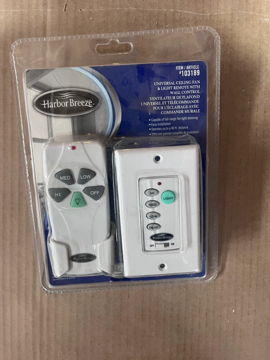 New in package. Includes remote and wall control. Easy installation. Operates up to 40ft. Compatible with most ceiling fans.