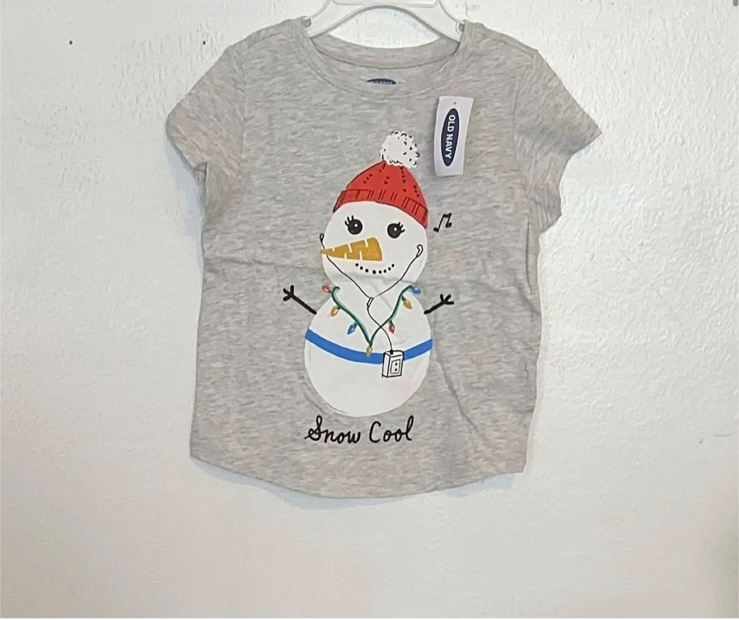 This grey Old Navy t-shirt features a fun snowman graphic with "Snow Cool" text. It's made from a soft, heathered material. A perfect addition for any little one's winter wardrobe!