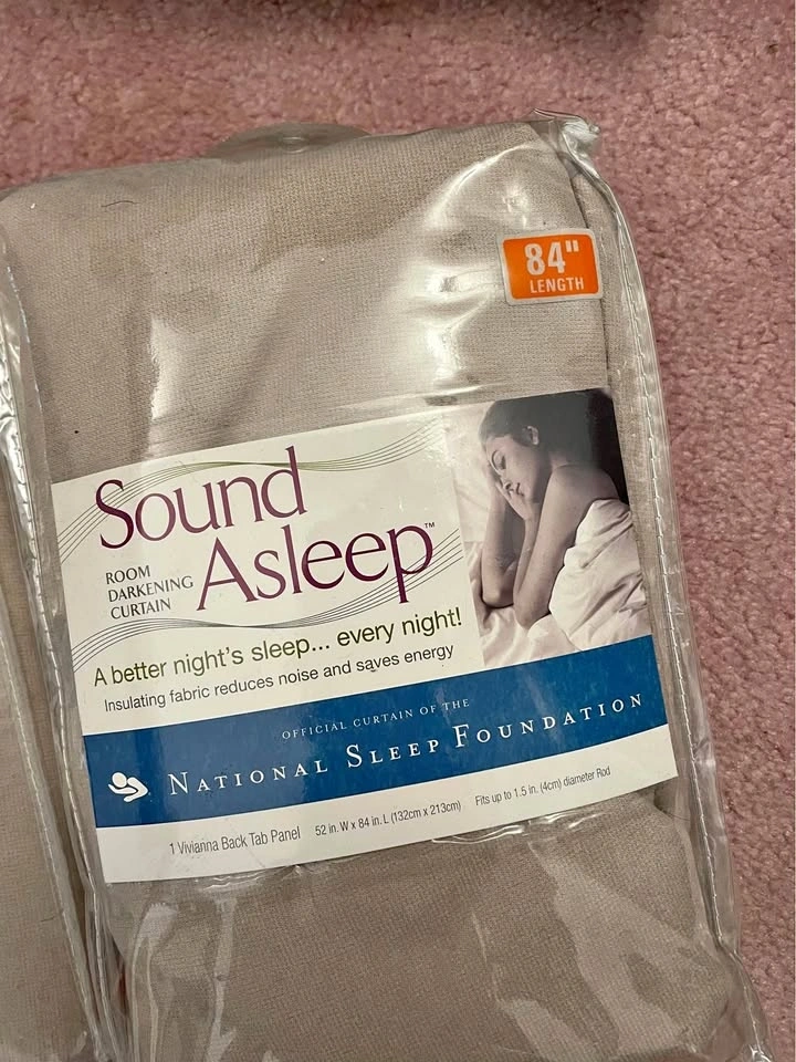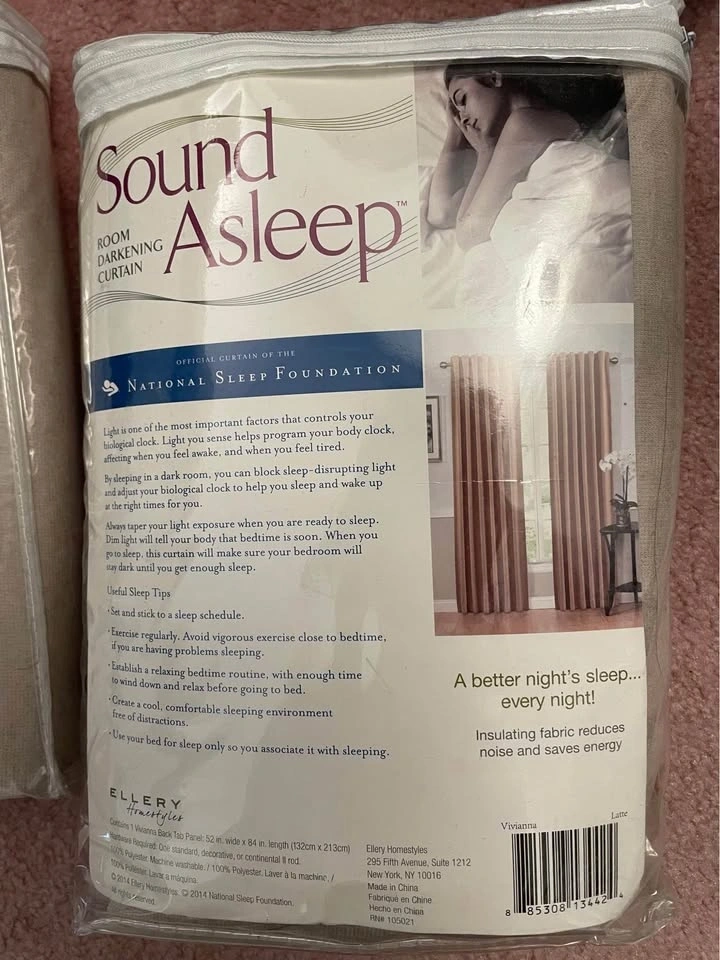 Two sets of Sound Asleep room darkening curtains in beige. Bought a while ago but never used as the landlord wouldn't allow them to be put up. Selling because they've just been sitting in the house. Dimensions: 52" (W) x 84" (L) - 132 cm x 213 cm. Fits up to 1.5 inch (4cm) diameter rod. Machine washable.