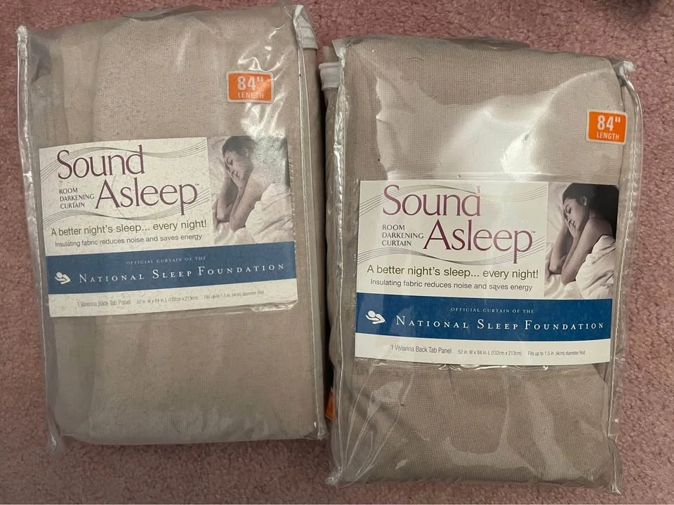 Two sets of Sound Asleep room darkening curtains in beige. Bought a while ago but never used as the landlord wouldn't allow them to be put up. Selling because they've just been sitting in the house. Dimensions: 52" (W) x 84" (L) - 132 cm x 213 cm. Fits up to 1.5 inch (4cm) diameter rod. Machine washable.