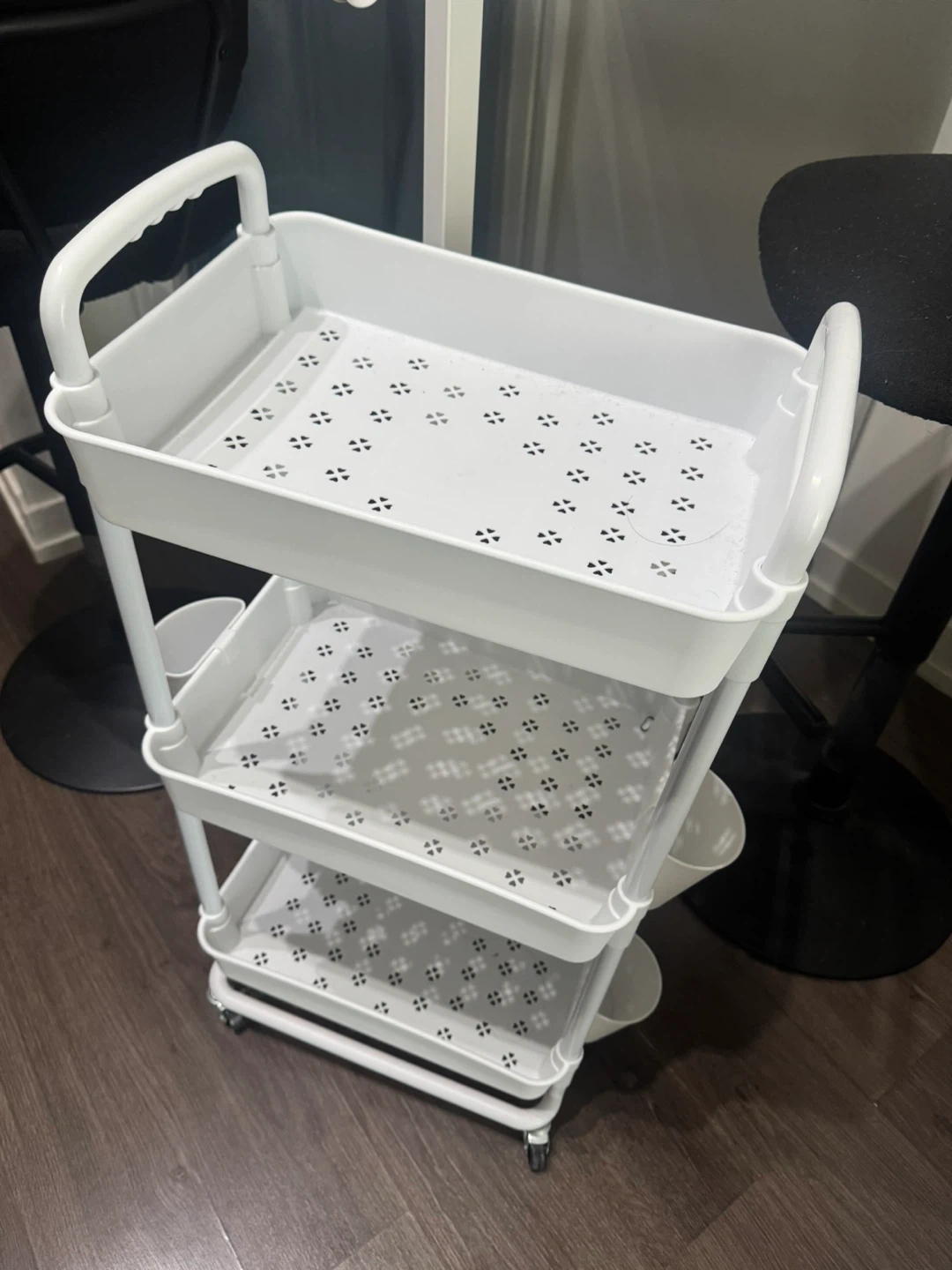 This is a handy 3-tier rolling cart. It's white and made of plastic. It has wheels for easy movement and comes with two side cups. Great for organizing supplies!