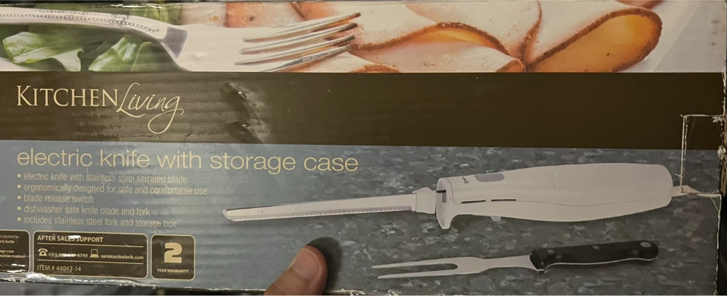 Brand new in box. Selling a Kitchen Living electric knife with storage case. It includes a stainless steel serrated blade, designed for safe and comfortable use. The set includes a dishwasher-safe knife blade and fork, along with a stainless steel fork and storage box. Pickup sandalwood and Kennedy Brampton
