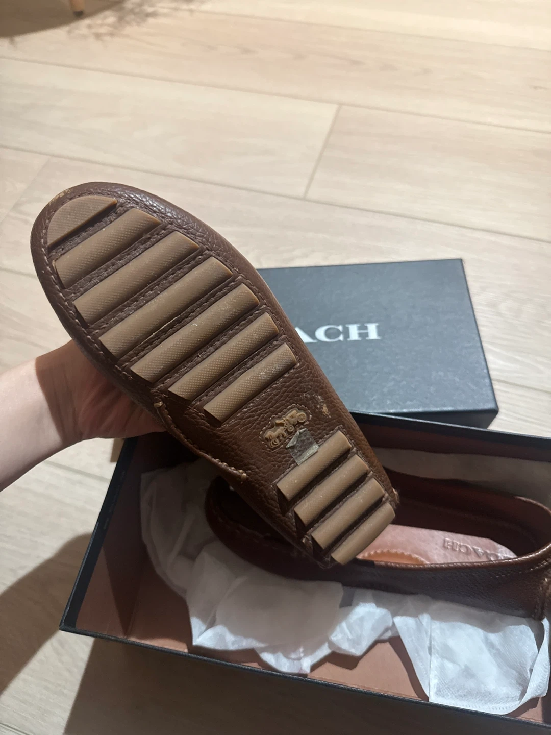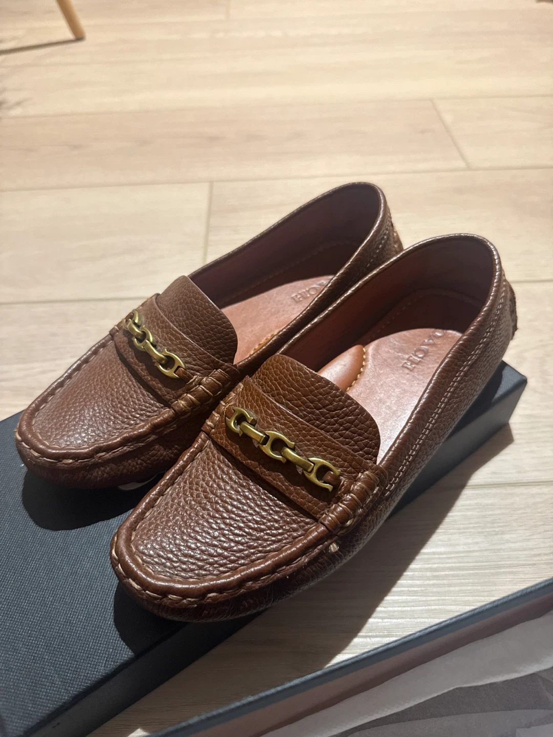 Vintage brown pebbled leather loafers from COACH. These shoes feature a gold chain accent across the vamp. Includes original COACH box. Genuine leather upper and lining. Very comfortable and fits snuggly.