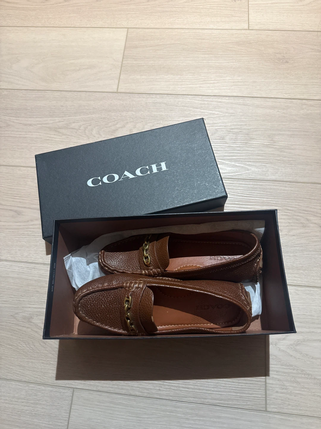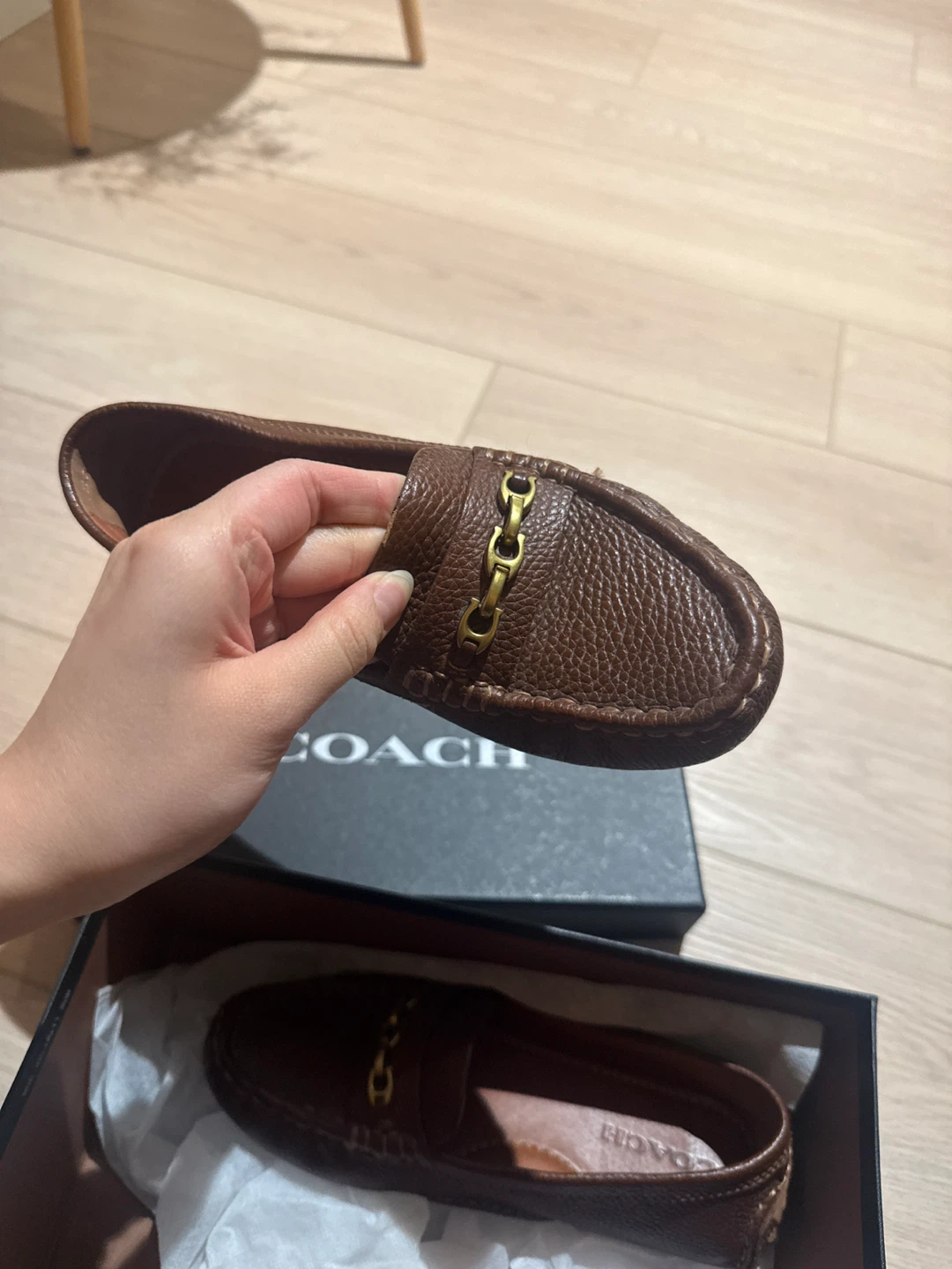 Vintage brown pebbled leather loafers from COACH. These shoes feature a gold chain accent across the vamp. Includes original COACH box. Genuine leather upper and lining. Very comfortable and fits snuggly.