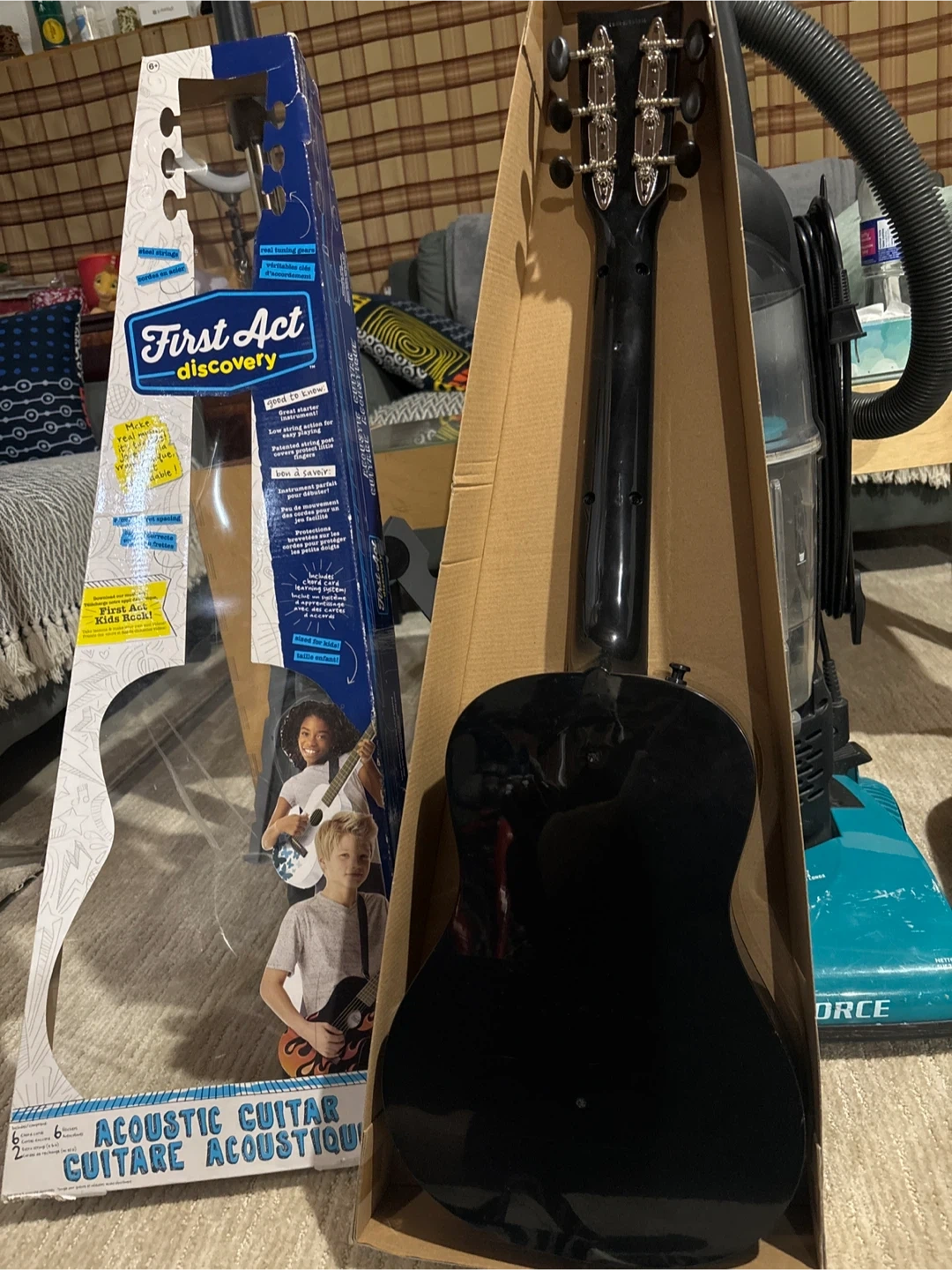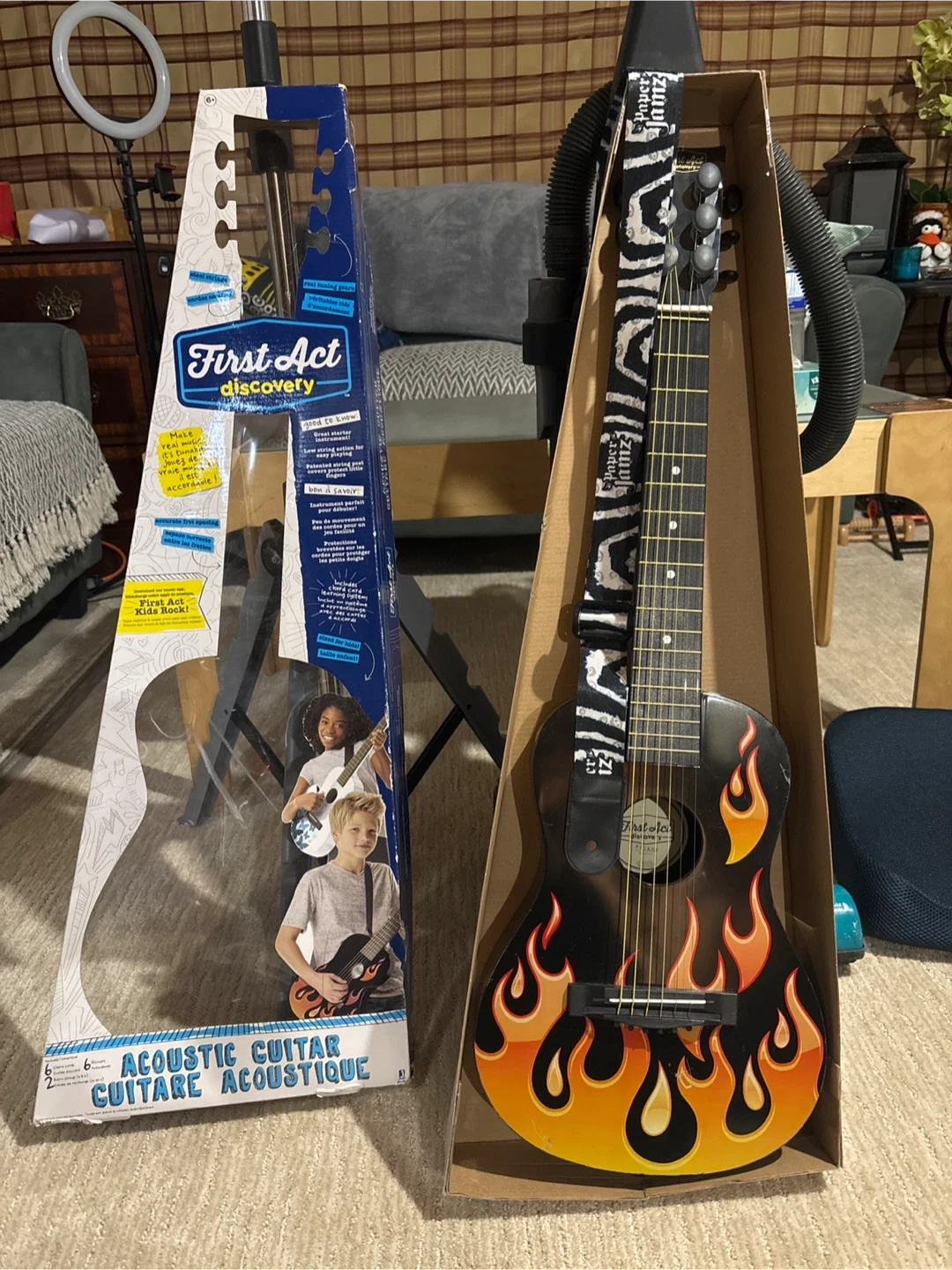 Black acoustic guitar with flame decals and a zebra-print strap. Comes in original packaging with a pick. Recommended for ages 6 and up. It's a kids' acoustic guitar!