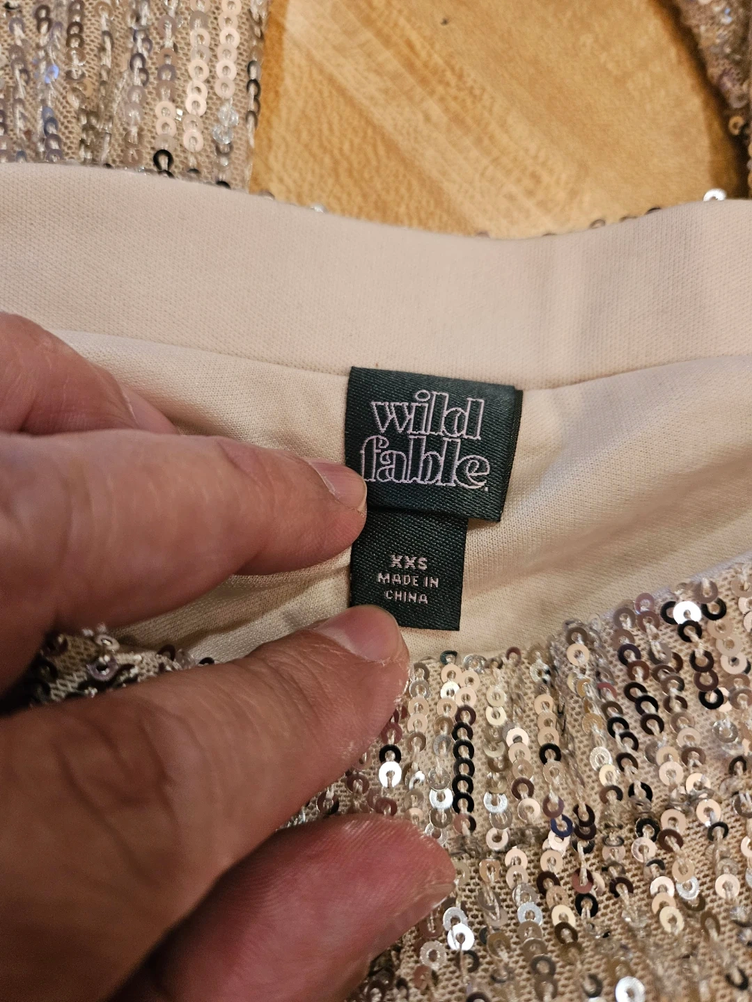 These are Wild Fable sequin flare pants in a size XXS. The shell is made of 95% recycled polyester and 5% spandex, while the lining is 100% polyester. They're super sparkly and fun! Pants are 38 inches long.
