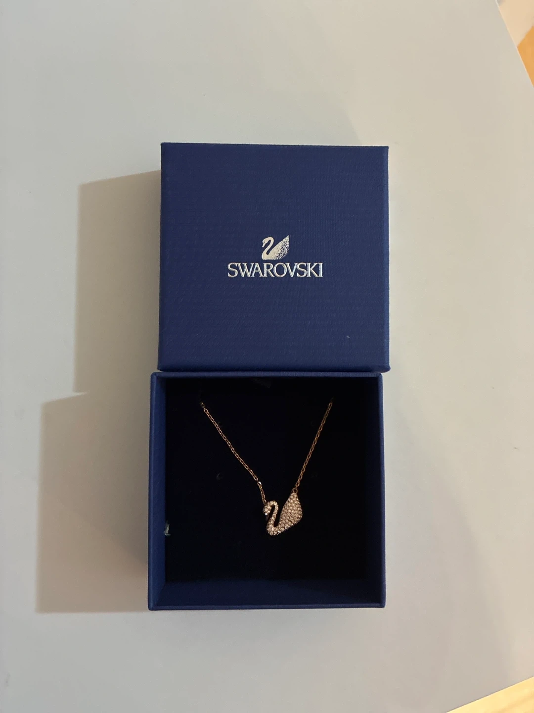 This is a Swarovski necklace featuring the iconic swan design. It comes in its original blue Swarovski box. The necklace is adorned with clear crystals.