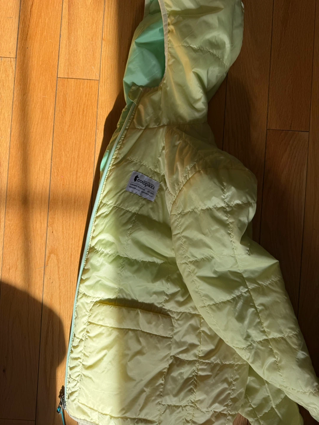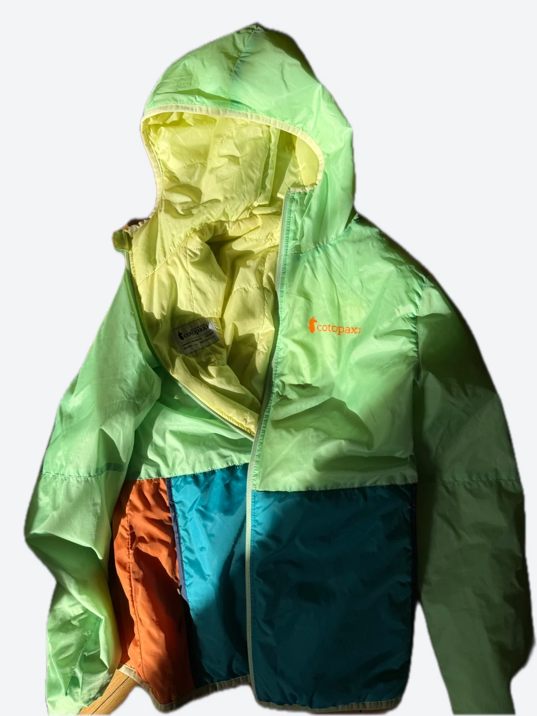 This is a Cotopaxi hooded jacket with a colourful block design. It's lightweight and features a full zip closure. Ideal for layering on cooler days. Two sided. Youth - size 12-14 years old.