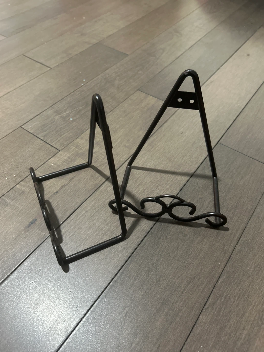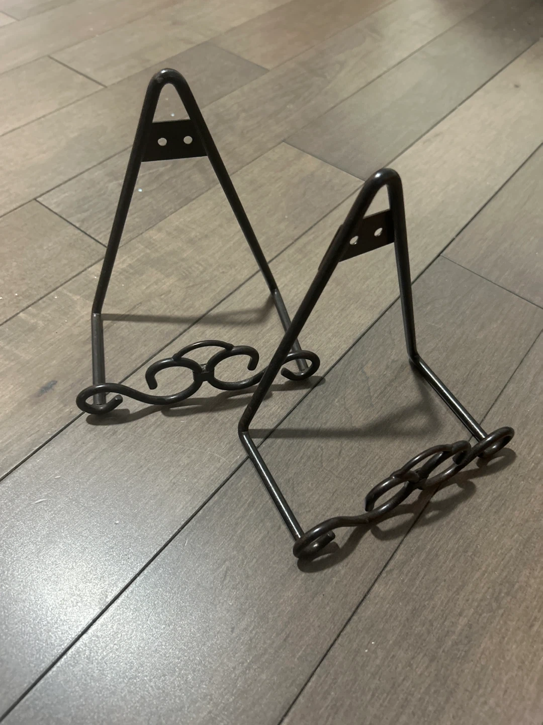 This is a set of two black metal display easels. They're designed to hold plates or small frames. The metal construction offers durability and a classic look.