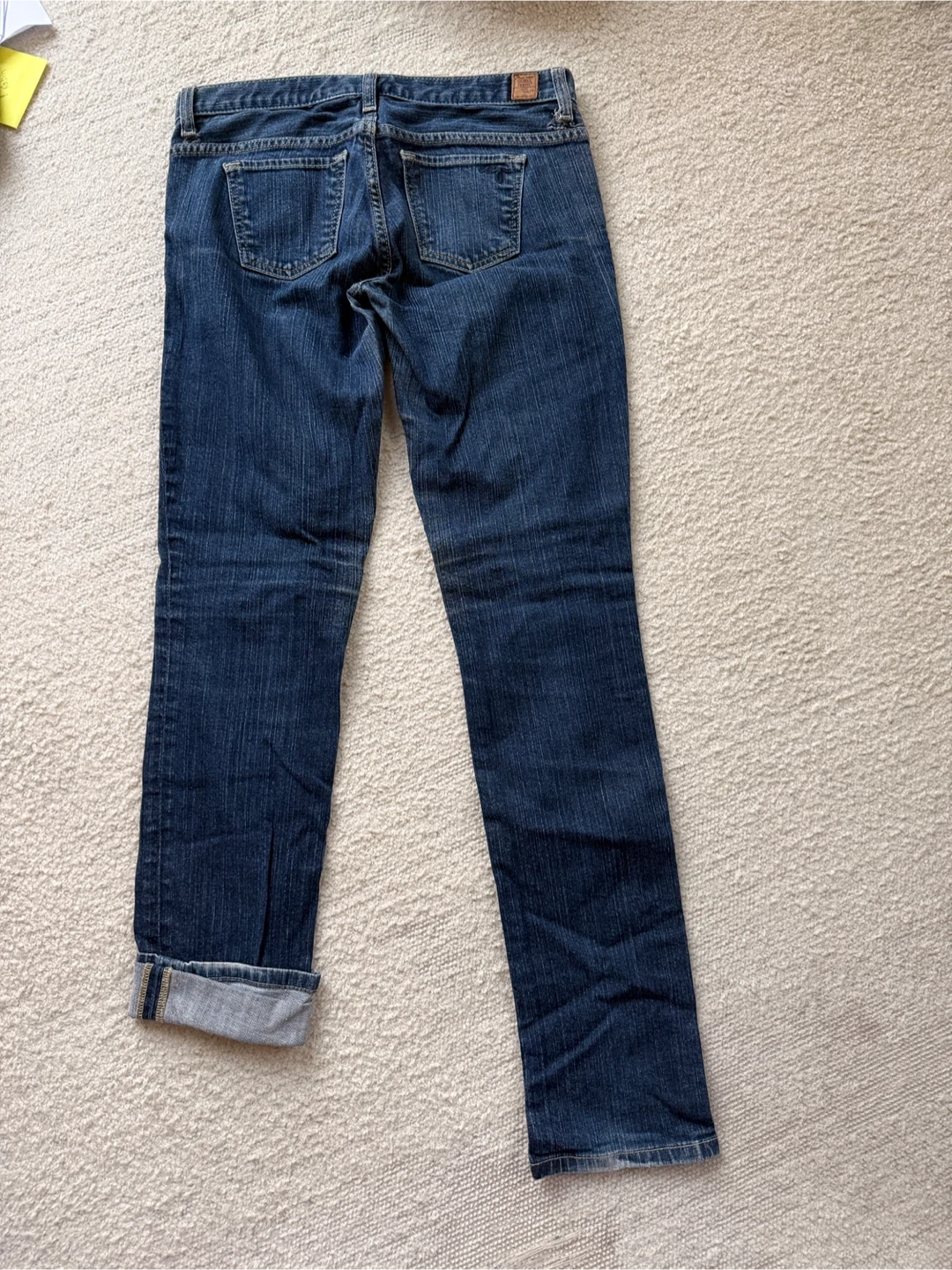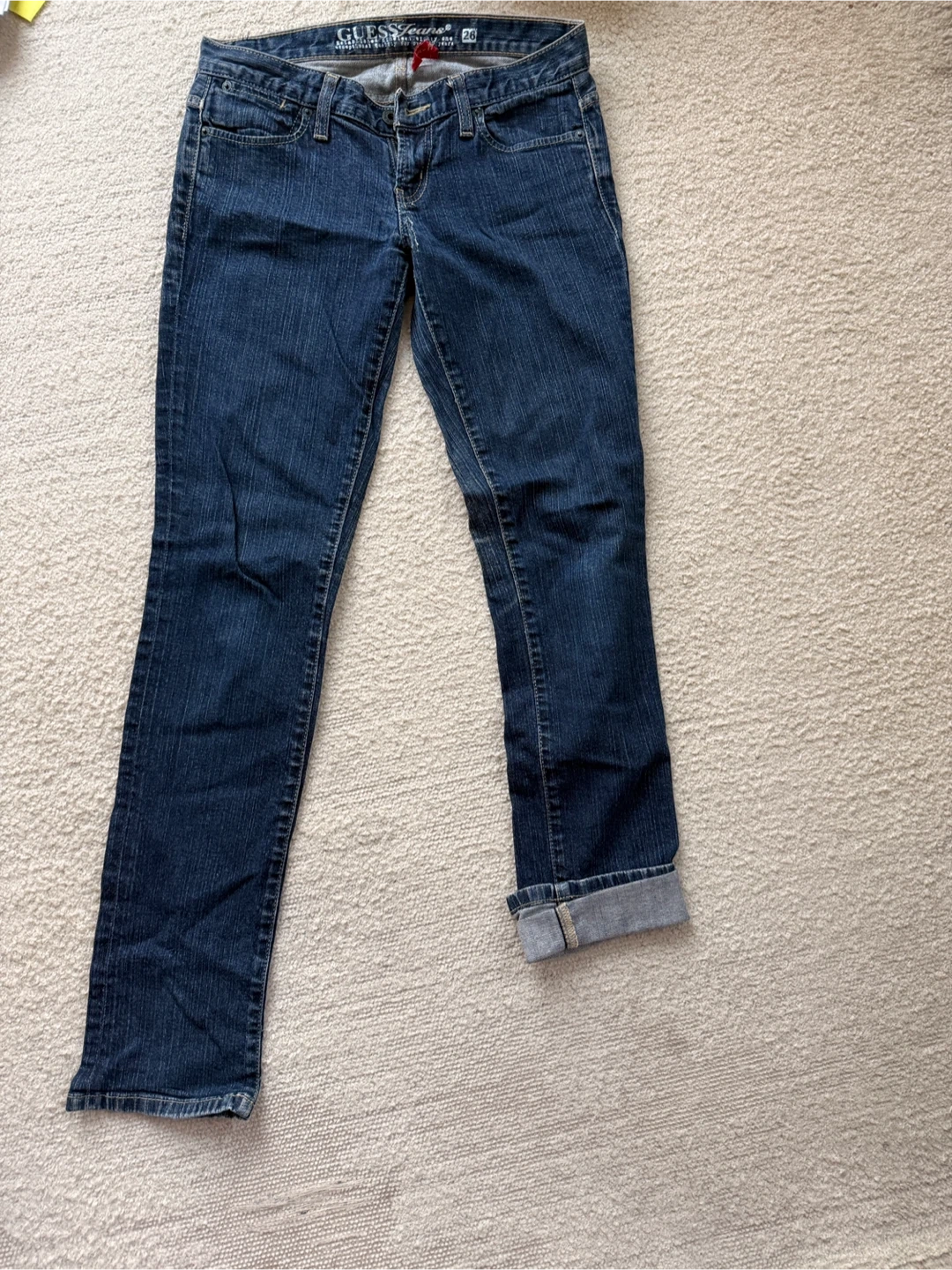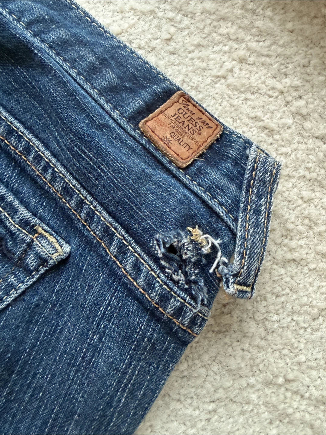 Classic blue denim jeans from Guess. There's one torn belt loop as shown in the photos.
