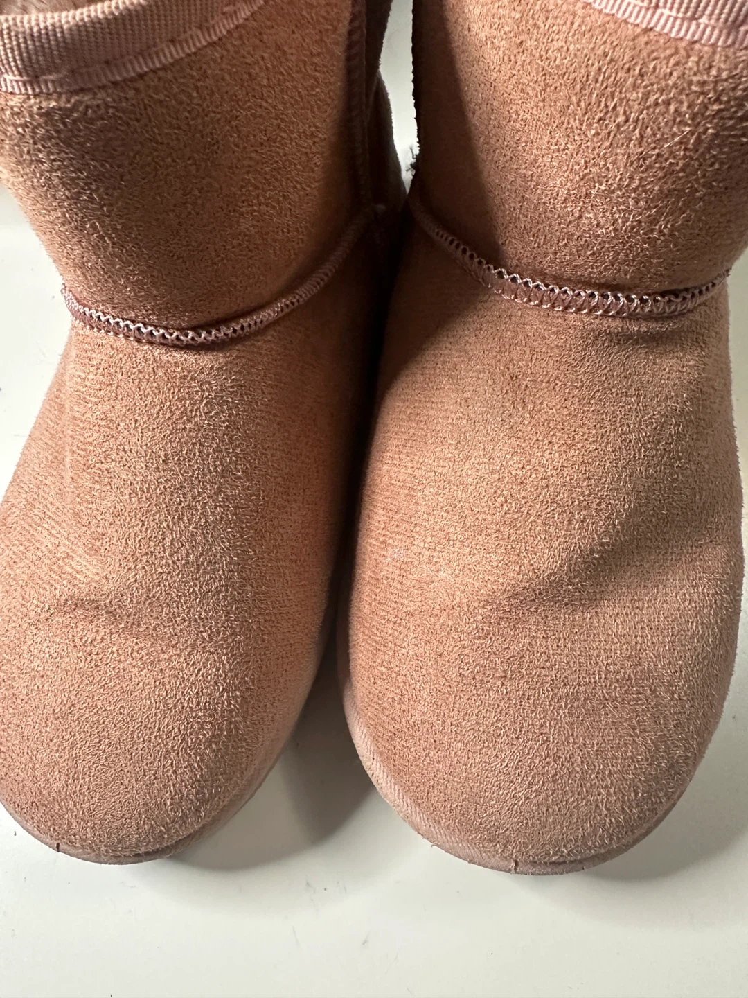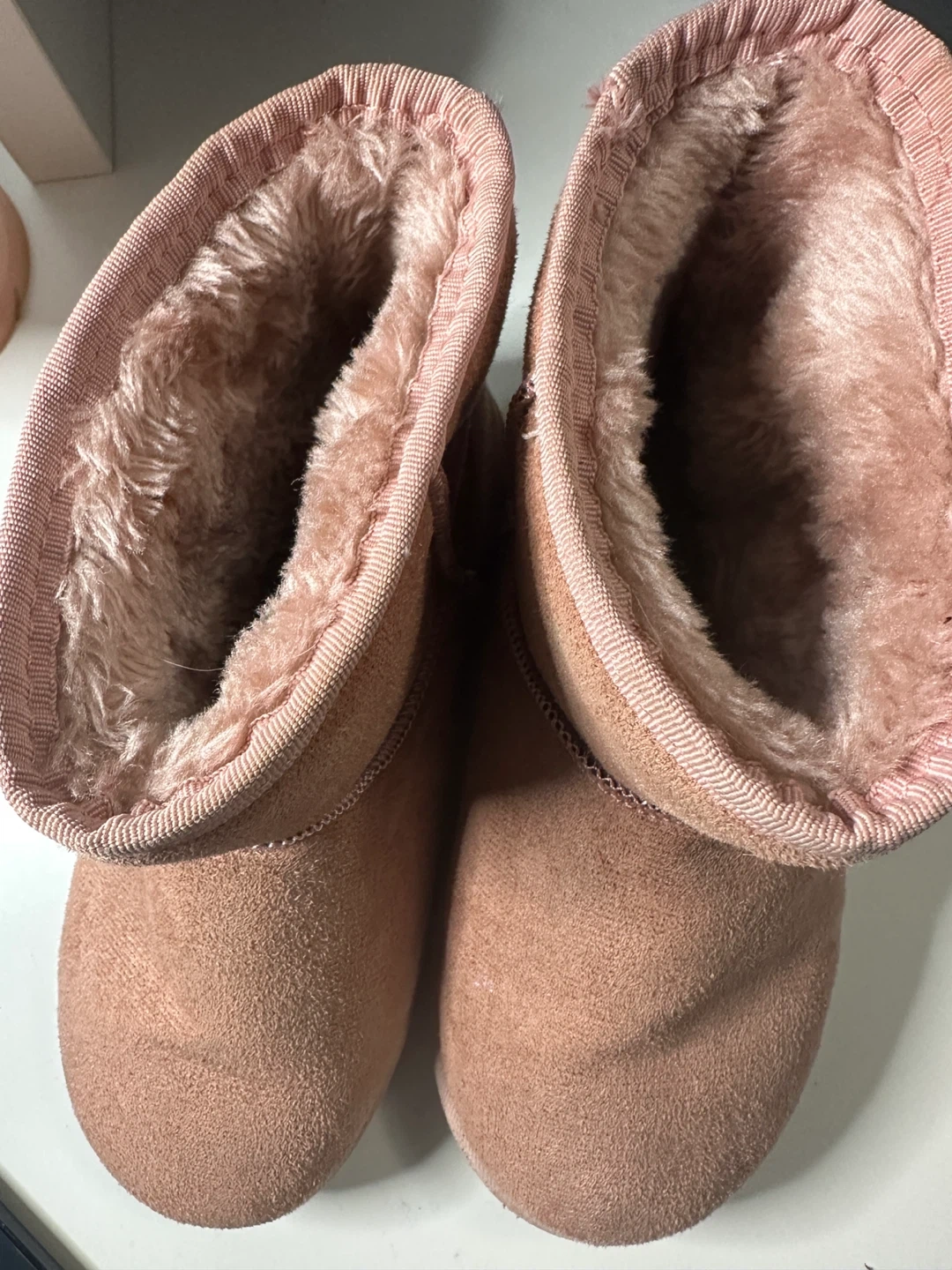 These Guabitu boots are a lovely soft pink color. They feature a cozy faux fur lining for extra warmth. The exterior material looks like suede. Perfect for keeping your feet toasty during colder weather!