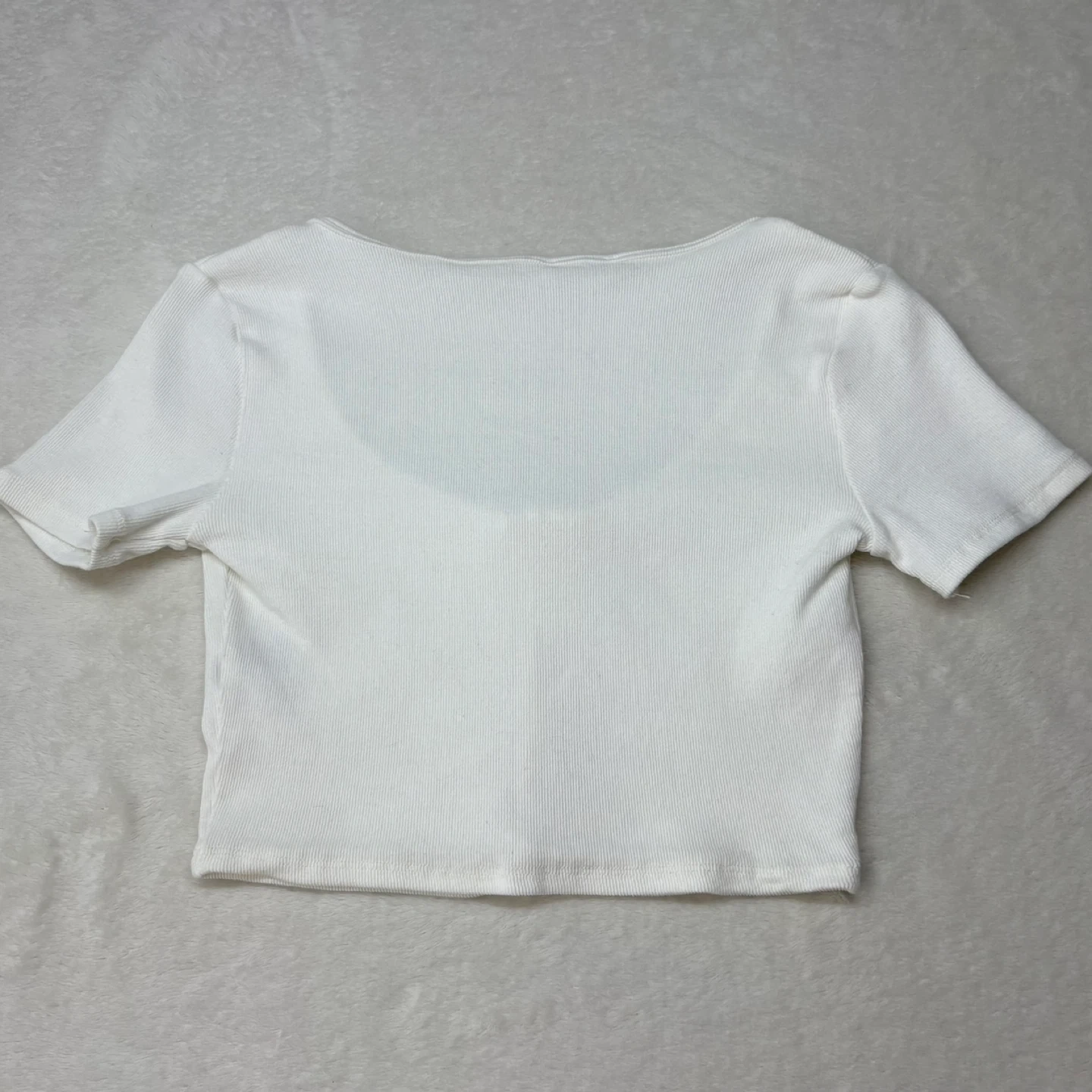 Classic and trendy ribbed knit crop top in a crisp white. Features a flattering V-neckline with a functional button-front detail and short sleeves. The soft, stretchy fabric provides a comfortable fit that's perfect for pairing with high-waisted jeans or skirts.