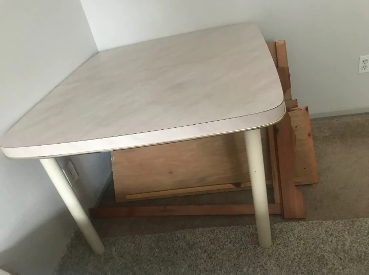 A square-top vintage table with white legs. The table surface has a neutral, speckled pattern. It's a great size for a small kitchen or dining area. Perfect for everyday meals!