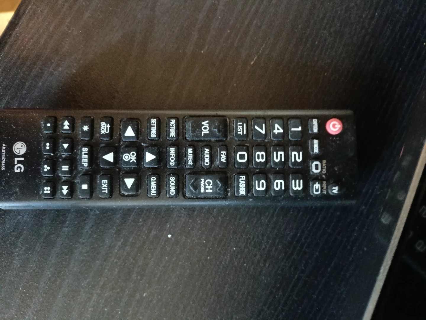This is an LG television with a dark wood stand. The stand has two open shelves for storage. Includes a remote control. Also two shelves each side