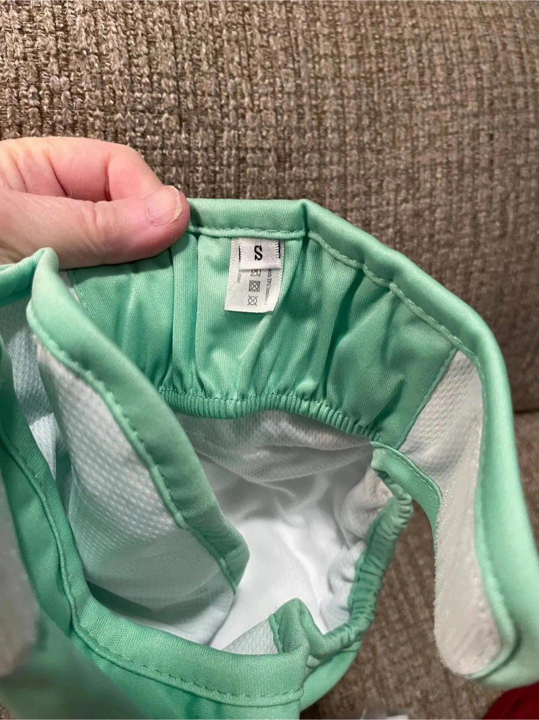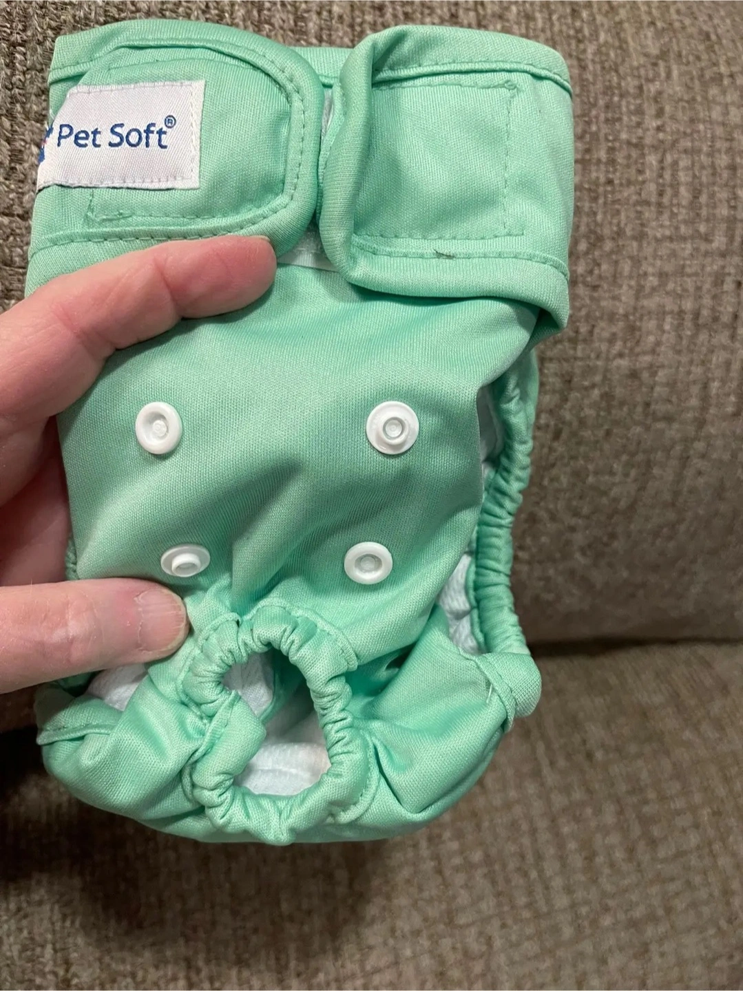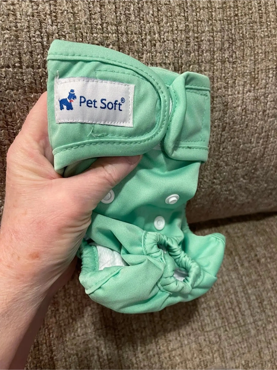This Pet Soft reusable dog diaper is a mint green, size small. It features adjustable snaps and an absorbent inner lining. Great for small dogs needing extra protection!