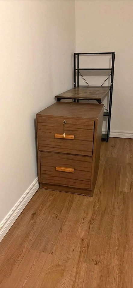 Sturdy wood grain filing cabinet with two spacious drawers. Includes key for the top lock. Finished in dark brown laminate with horizontal wood texture and matching wooden handles.