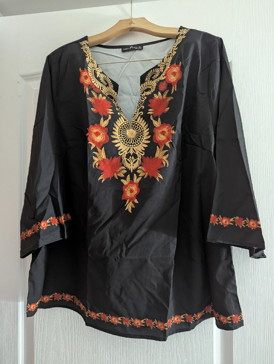 Selling a beautiful black tunic top from Sweet Romeo. It features stunning red and gold embroidery around the neckline and hem. It's brand new.