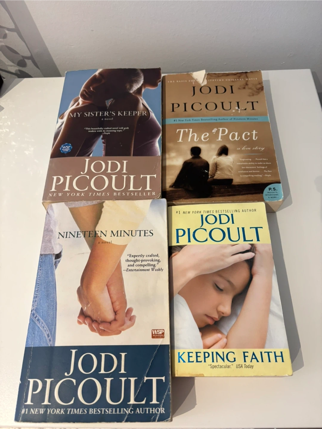 Four novels by bestselling author Jodi Picoult. Includes 'My Sister's Keeper', 'The Pact', 'Nineteen Minutes', and 'Keeping Faith'. These are all paperback editions all 4 for $10