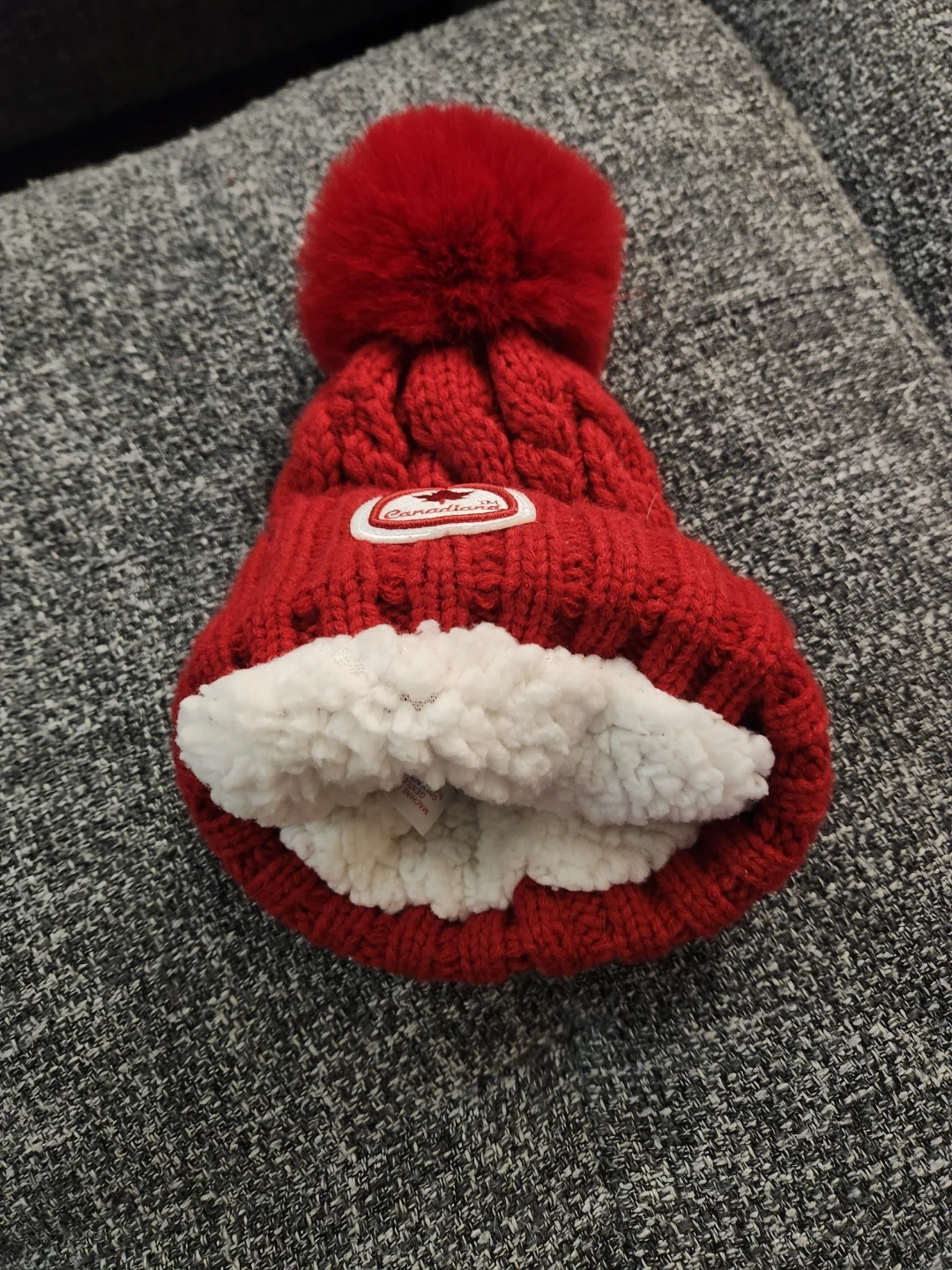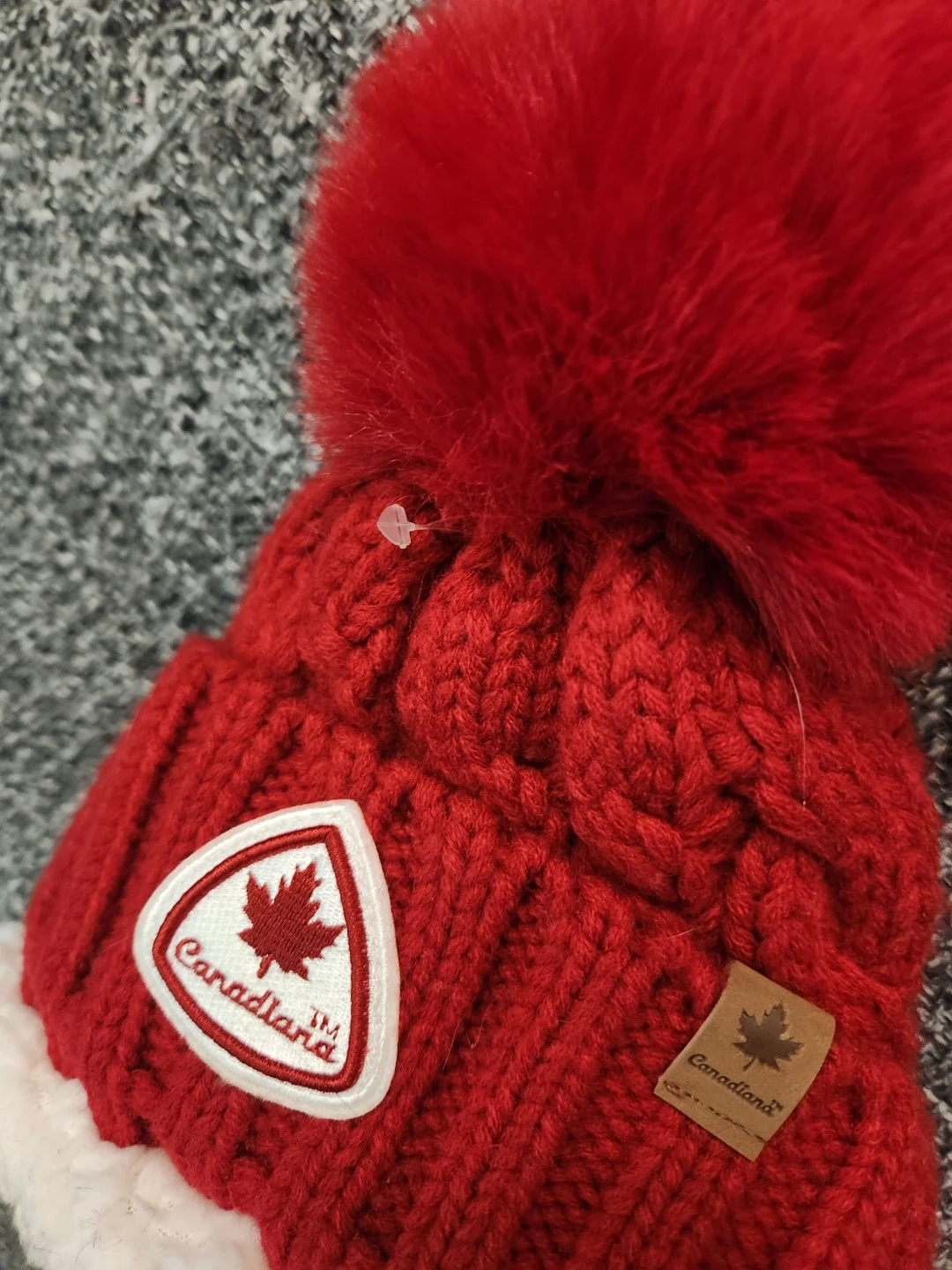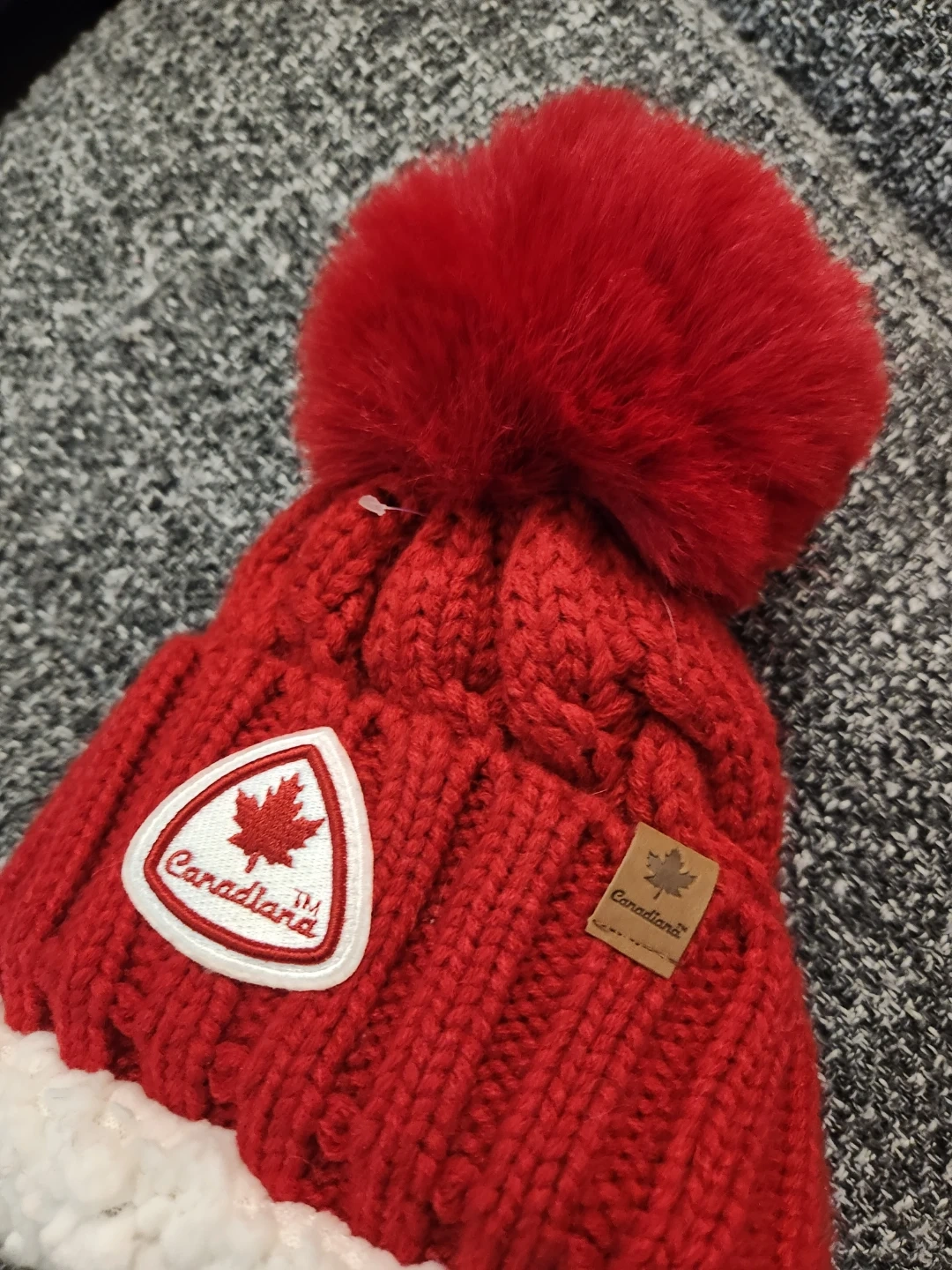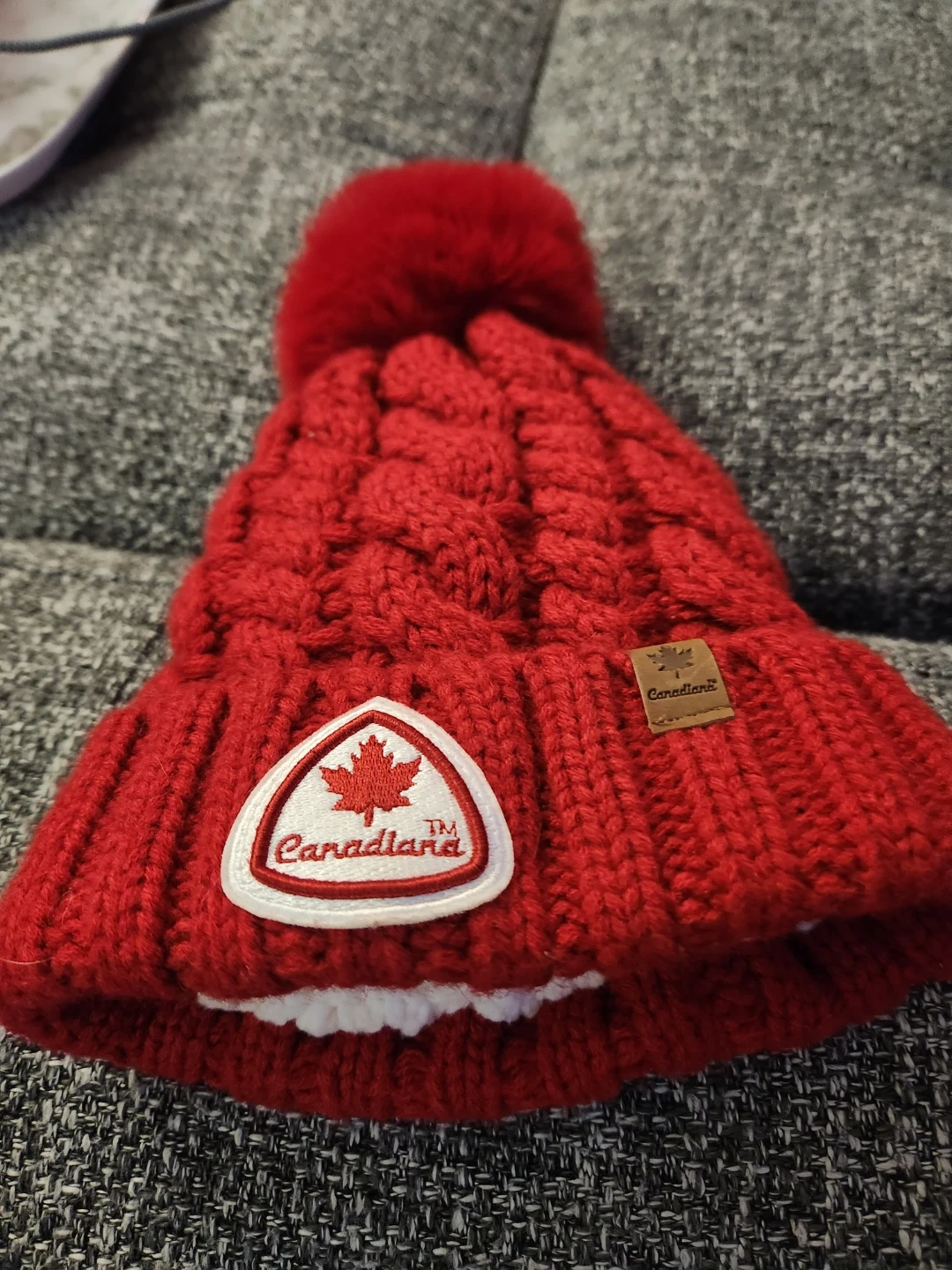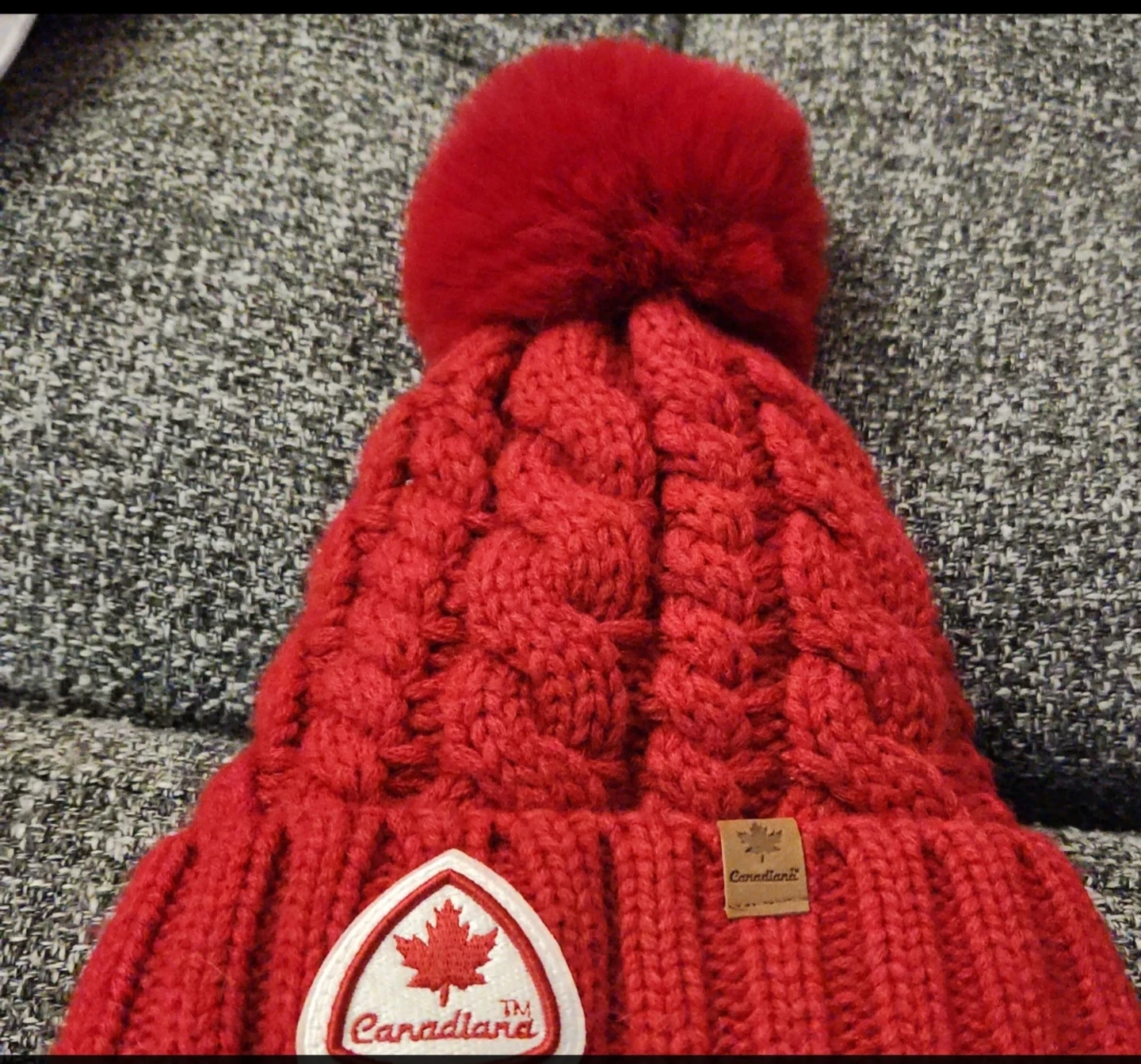 This Canadiana toque is bright red with a cable knit pattern and a fluffy pom pom. It features a maple leaf patch and a small leather tag with the brand name. It's made of a warm, knitted material.