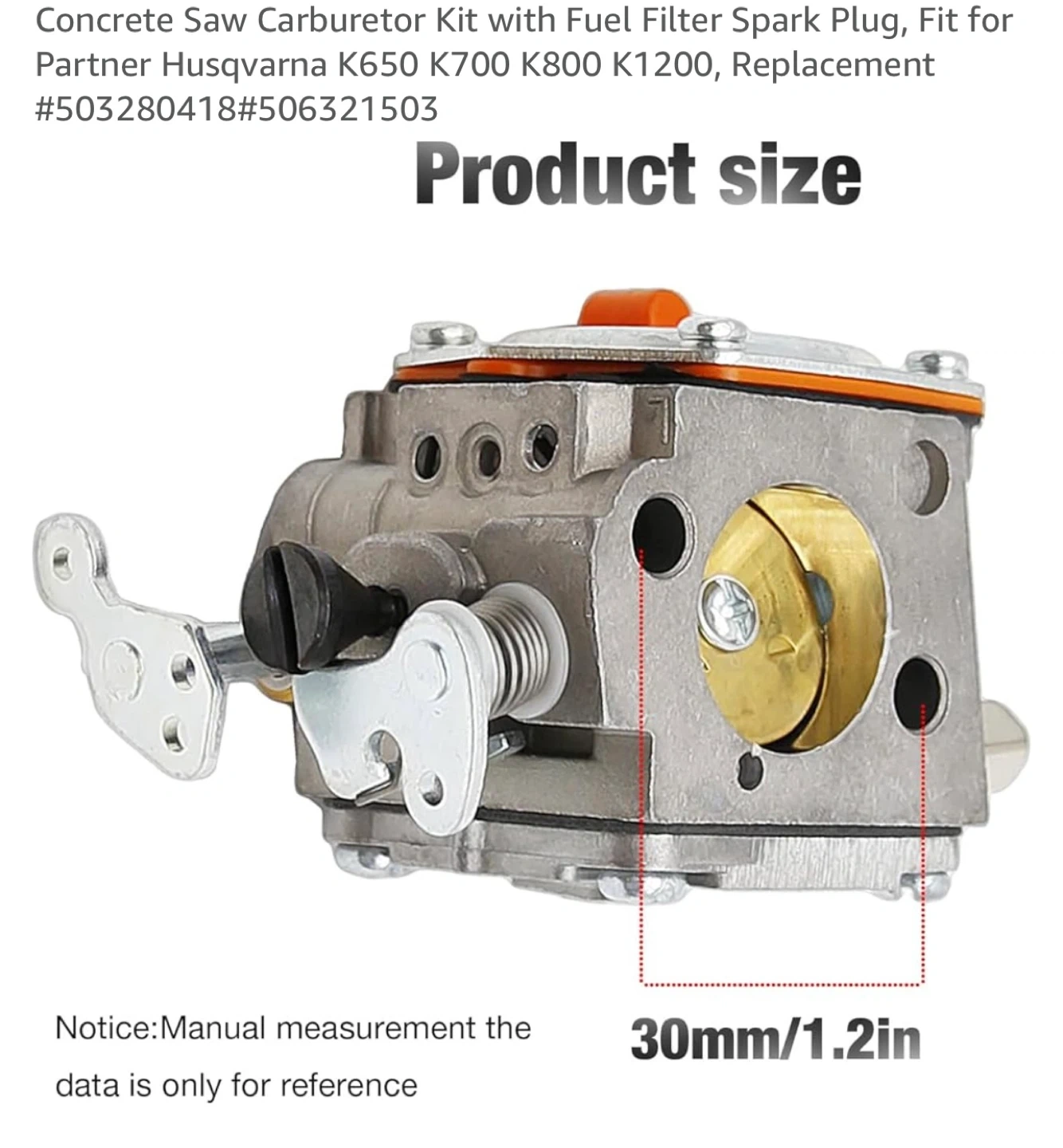 This is a replacement carburetor kit. It's compatible with Partner Husqvarna K650, K700, K800, and K1200 models. Manual measurement shows the size as 30mm/1.2in.