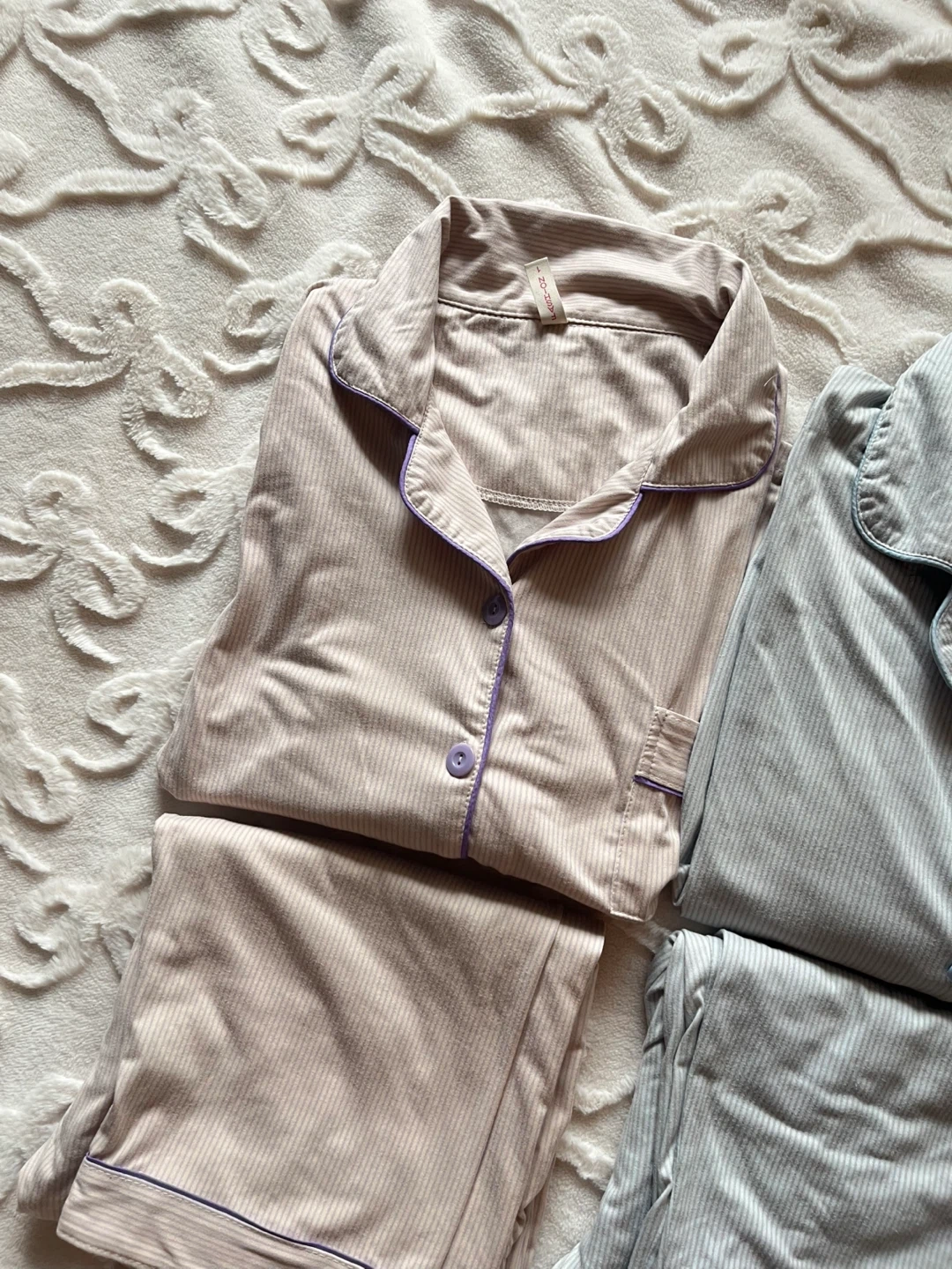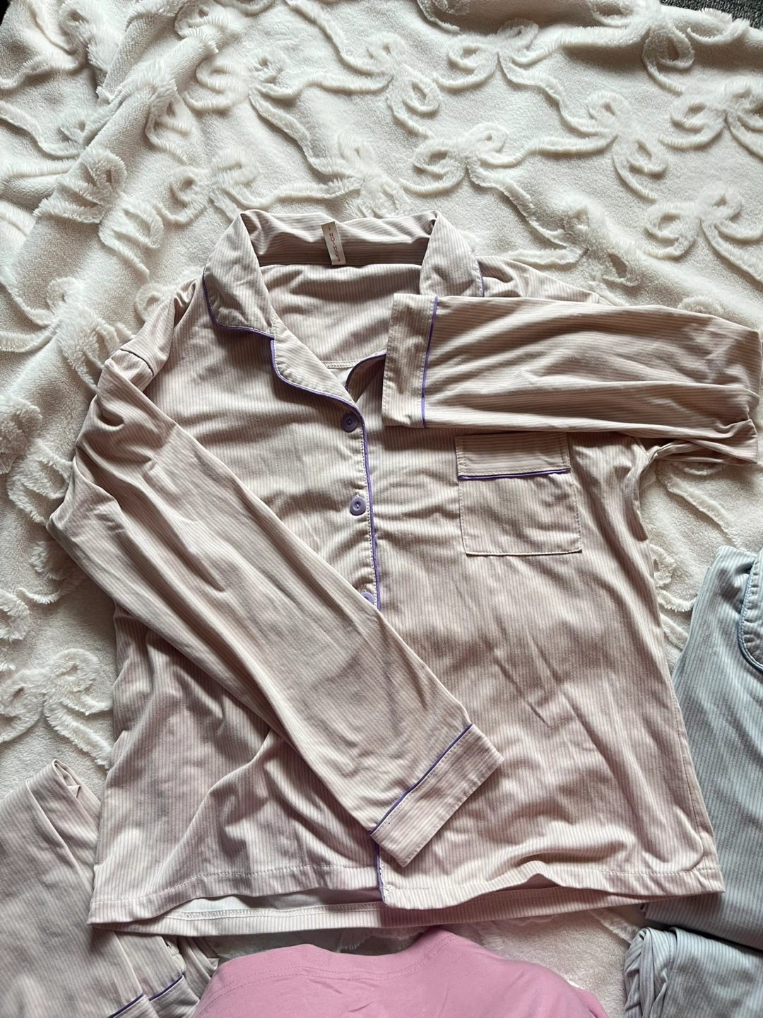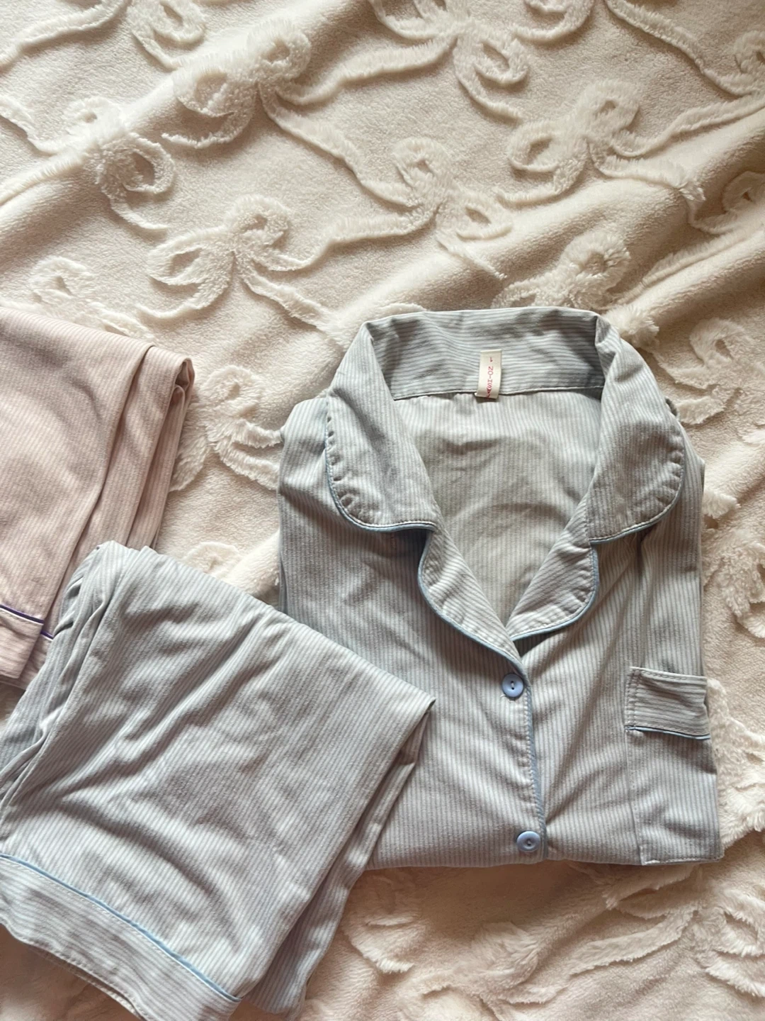 Two comfy pajama sets up for grabs! One is a soft pillow pink with purple trim, and the other is a light blue with matching trim. Both are in great condition.