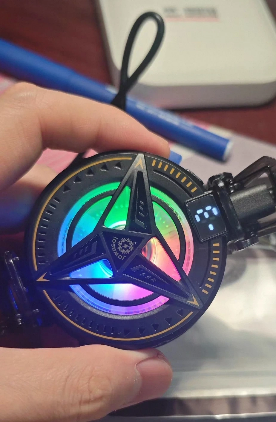 This RGB phone cooler features a cool LED light display. It's designed to attach to your phone using a clip. It works well for keeping your phone cool during long gaming sessions.