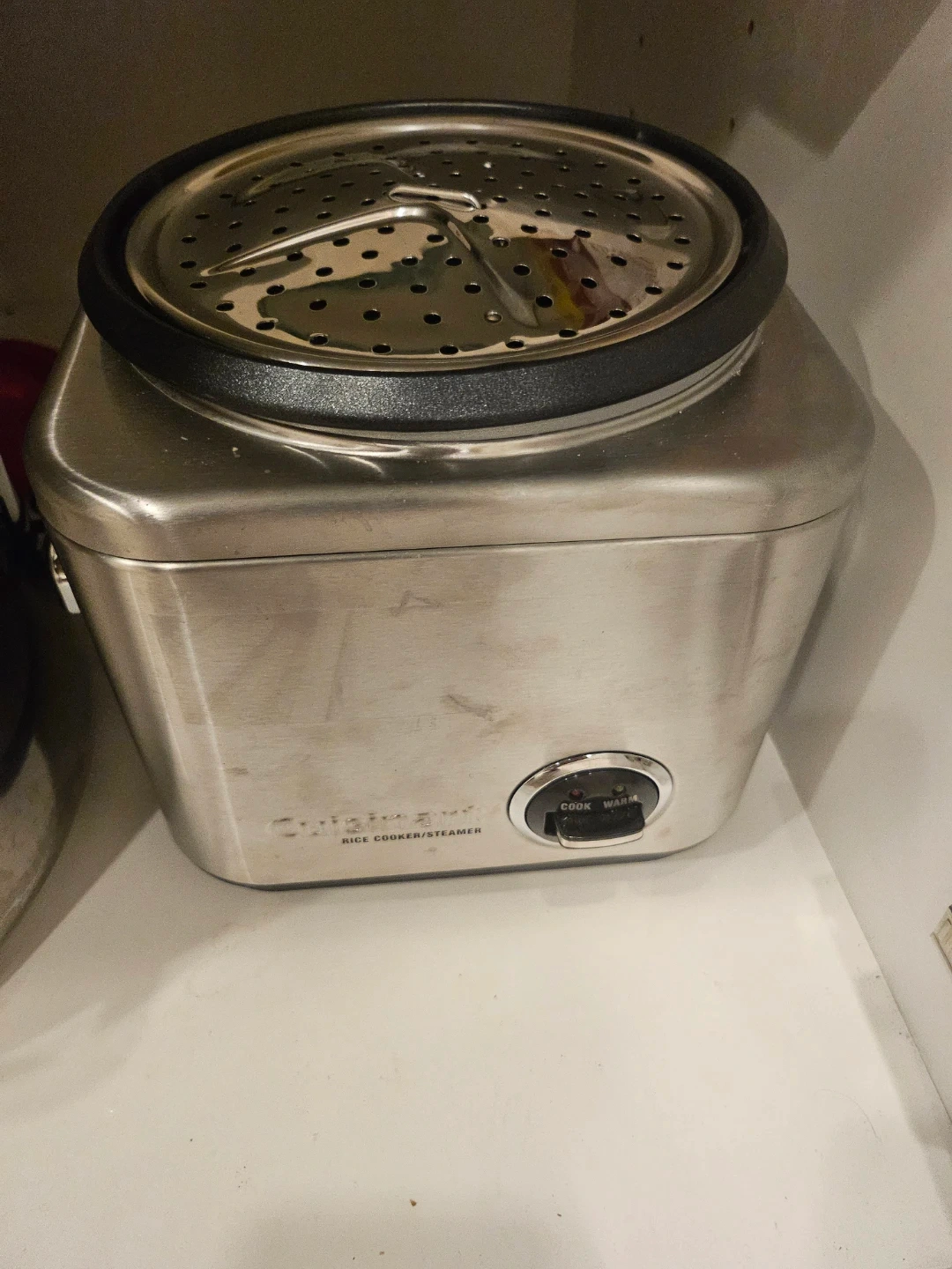 This Cuisinart rice cooker and steamer is in stainless steel. It has cook and warm settings. Great for making rice or steaming food!
