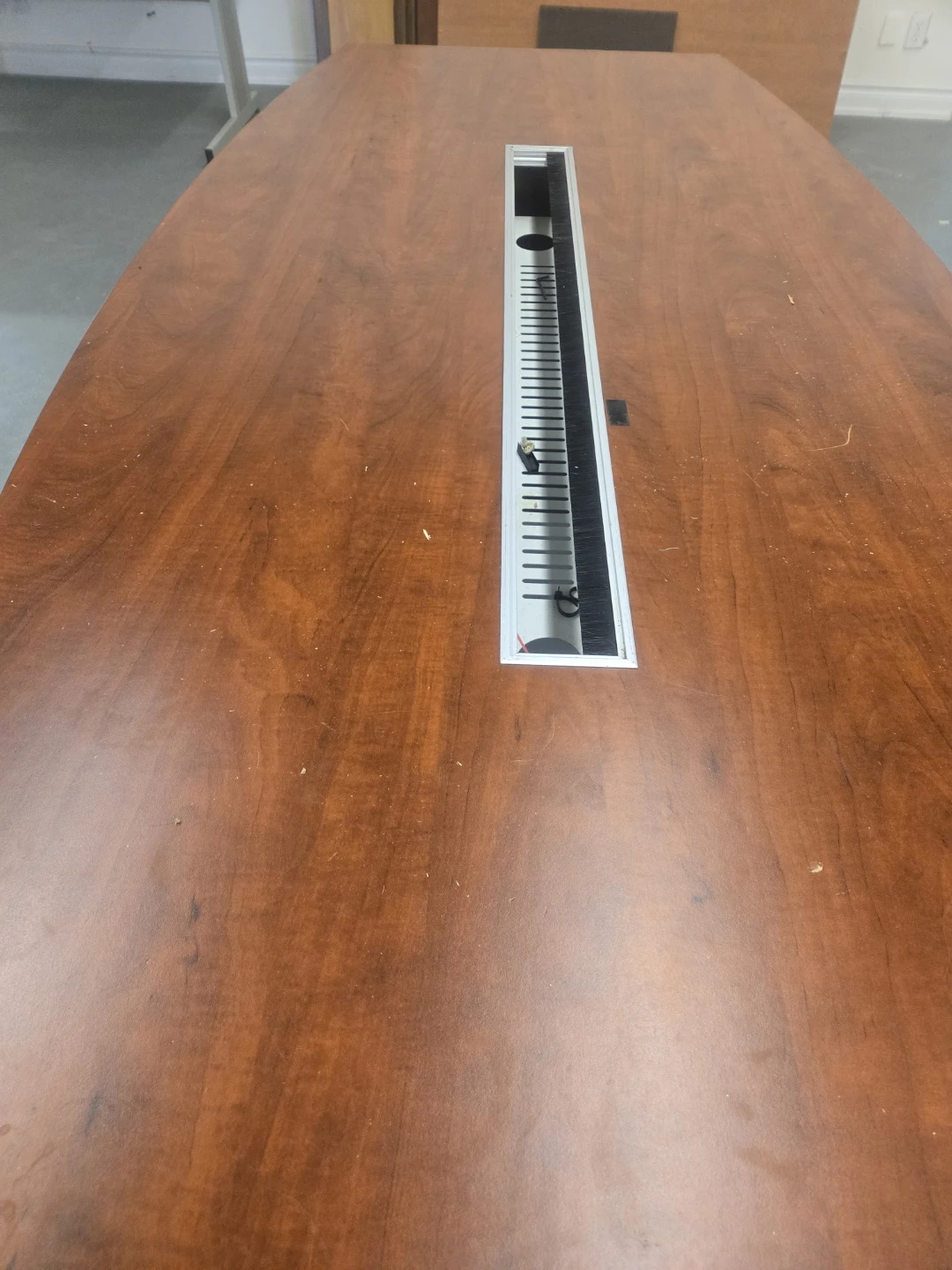 This conference table features a cherry wood finish and a central trough for easy cable management. It's designed to keep your meeting space tidy and organized. This table is perfect for any boardroom or meeting room!