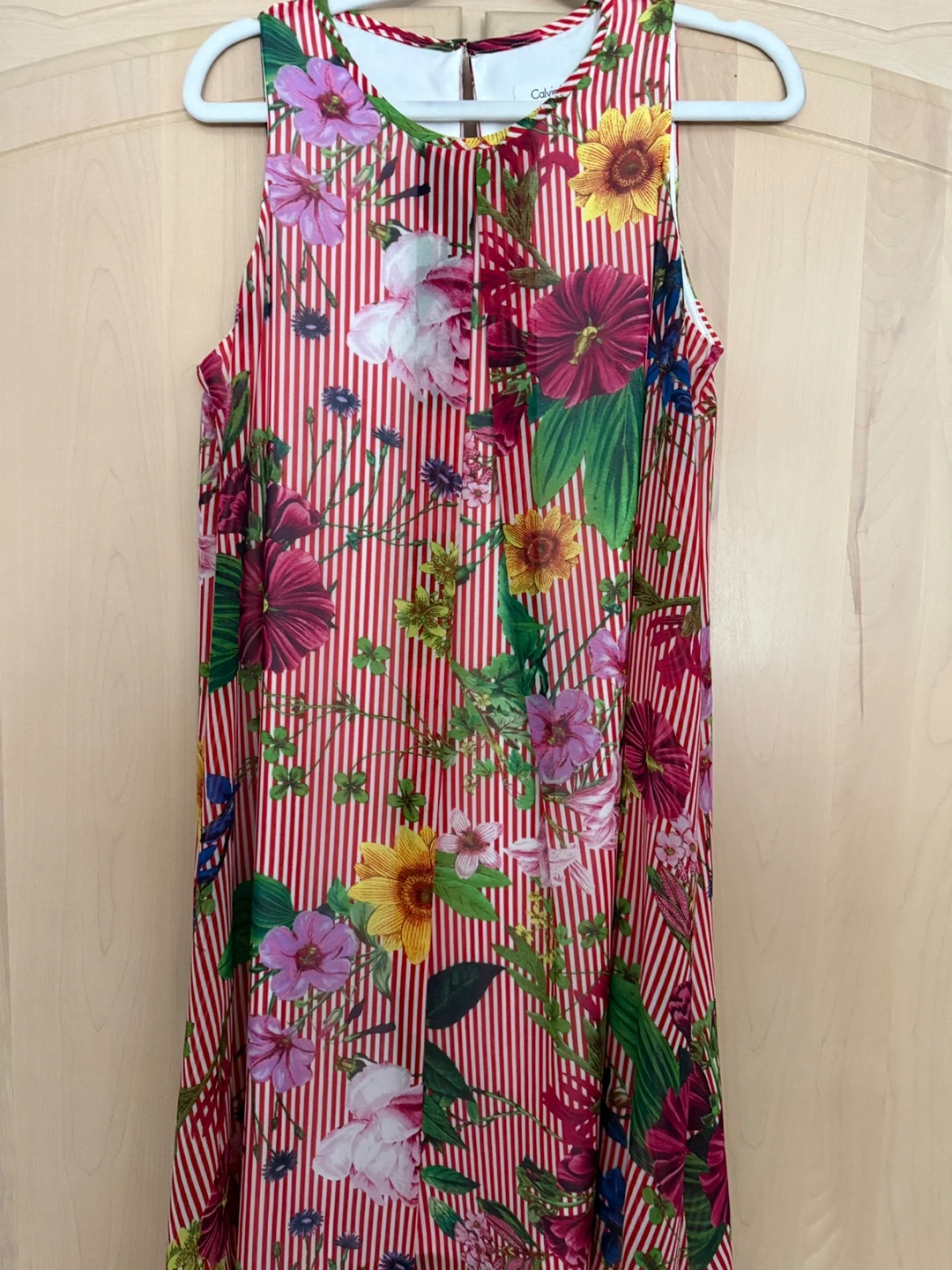 This Calvin Klein sleeveless dress features a vibrant floral print on a red and white striped background. It's a size 8. This dress is perfect for warmer weather occasions!