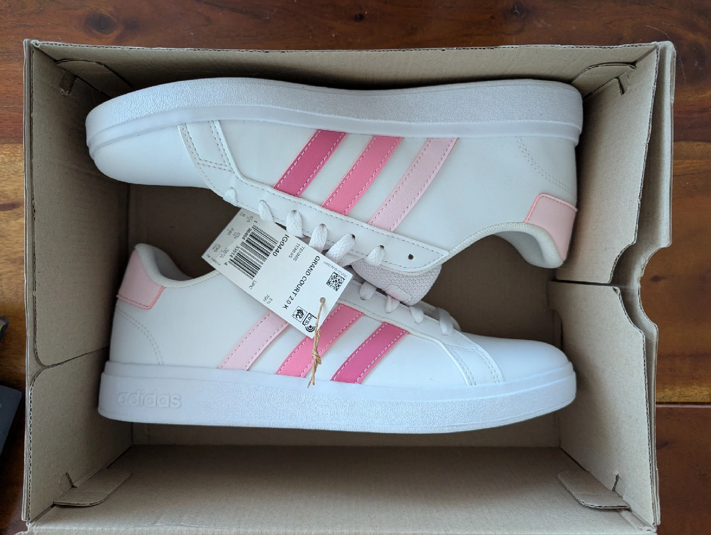 These are brand new Adidas Grand Court 2.0 K sneakers in white with pink stripes! They are a US Big Kids size 6 and come with the original box. They fit me and I wear Women's size 7 in Adidas shoes and I'm 7.5 in other brands.