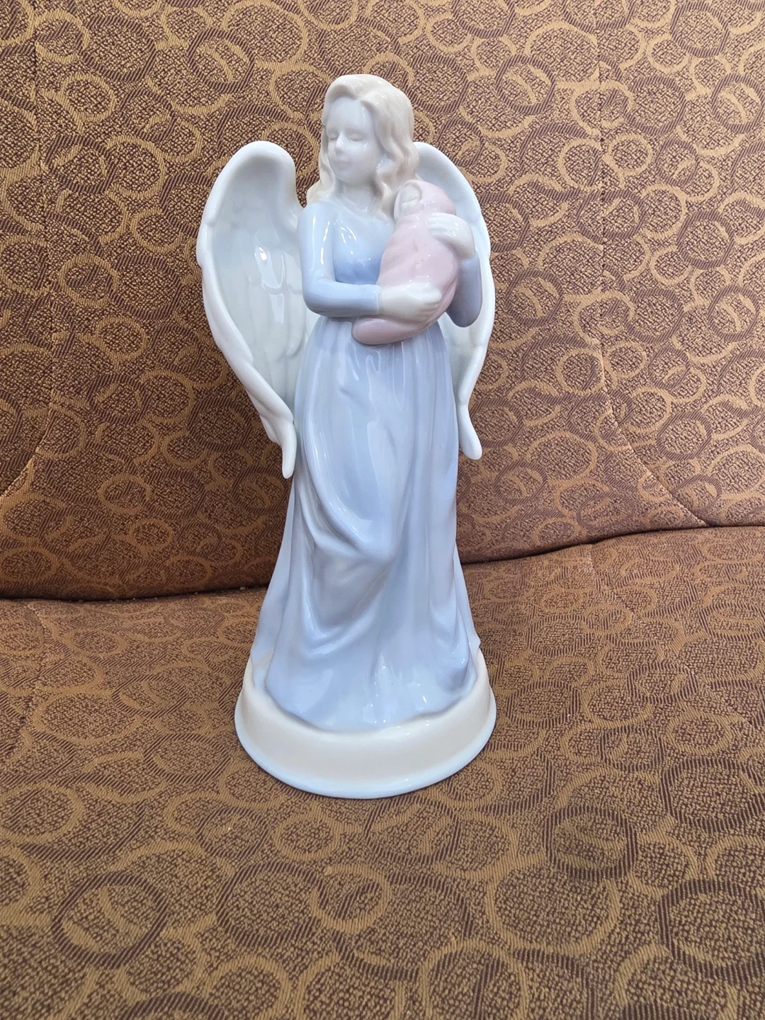 This beautiful ceramic figurine depicts an angel tenderly holding a baby. It's crafted in a lovely light blue and white glaze. This piece would make a sweet addition to any home decor.