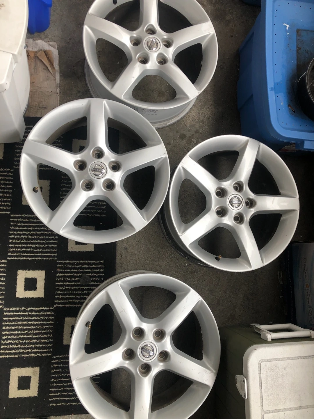 Selling a set of four used Nissan alloy wheels. These are 5-spoke wheels, silver in colour. They're in decent condition, ready for a new vehicle. These wheels fit various Nissan models.