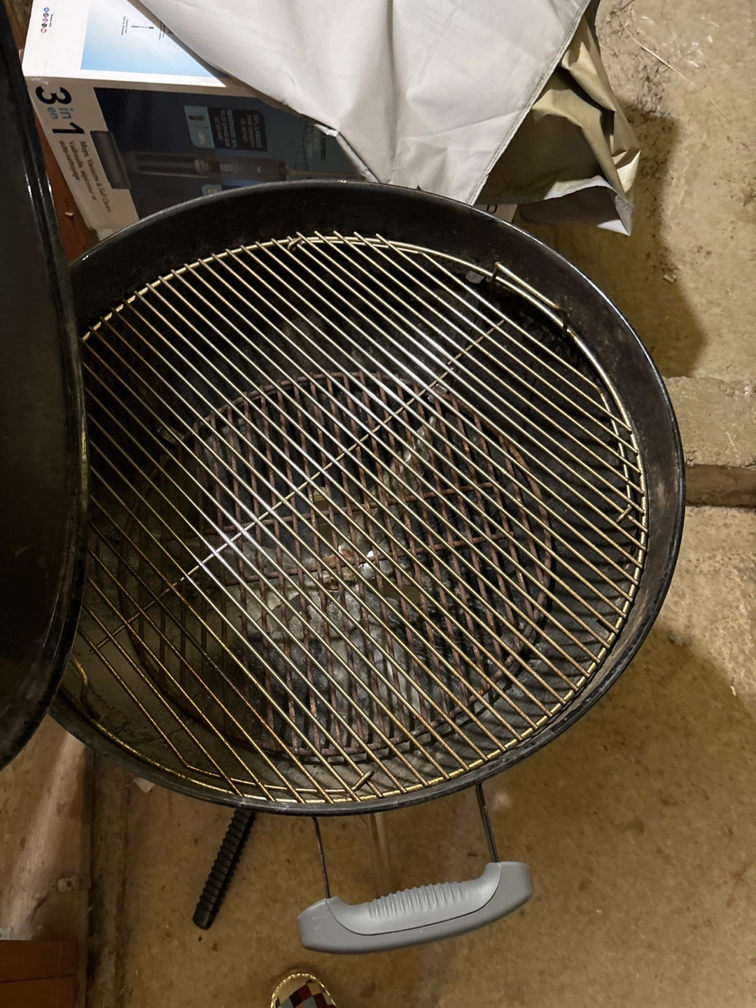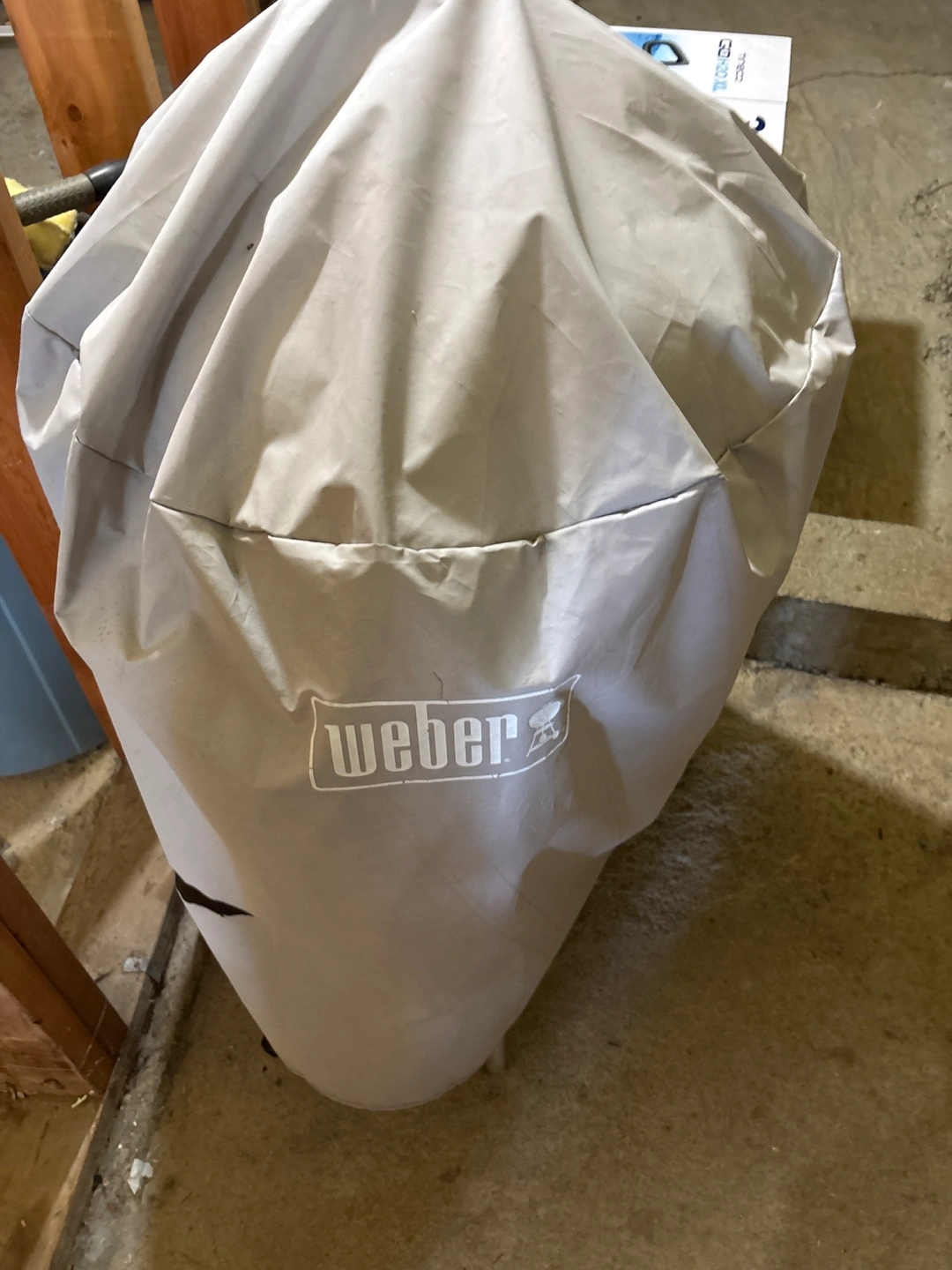 Weber charcoal grill with a black exterior. It includes a cooking grate and a lid. This grill would be perfect to use on a warm summer evening. It includes a gray cover.