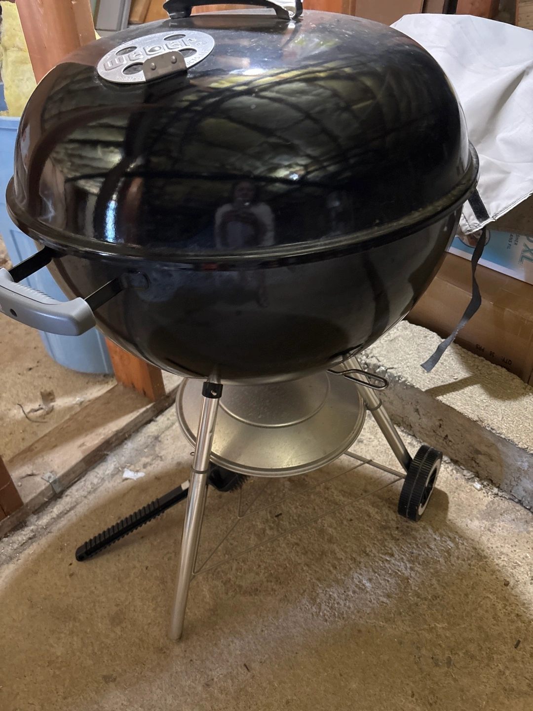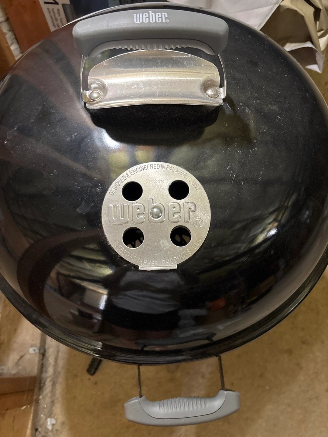 Weber charcoal grill with a black exterior. It includes a cooking grate and a lid. This grill would be perfect to use on a warm summer evening. It includes a gray cover.