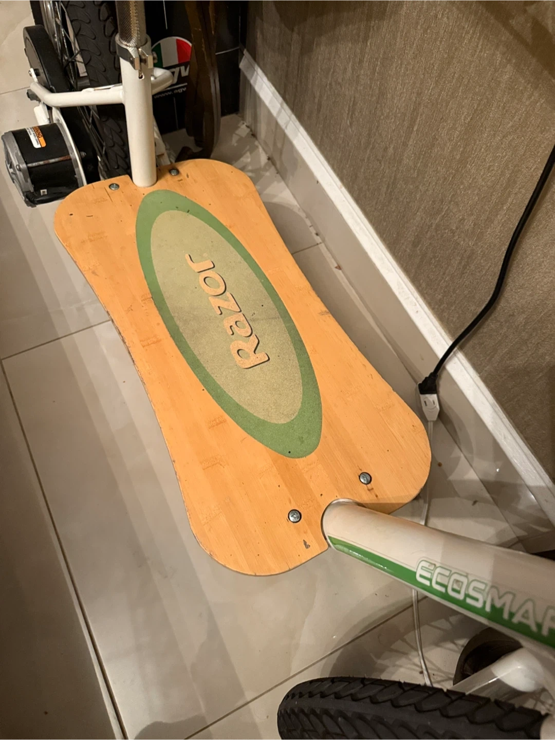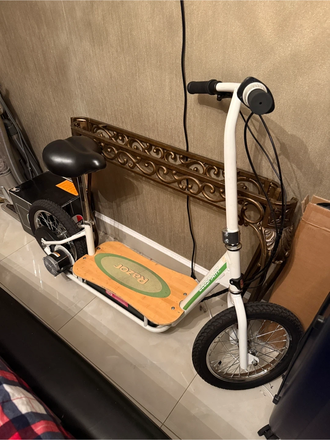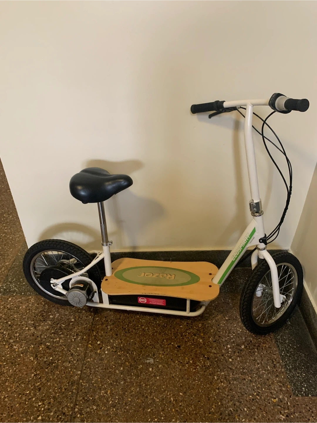 Selling a Razor EcoSmart electric scooter. It has a wooden deck and a seat for comfortable riding. Great for short commutes or just cruising around! New battery.
