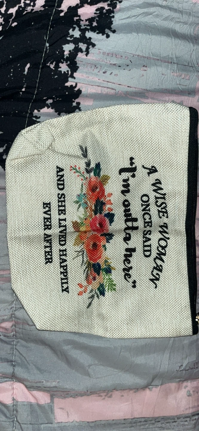 This zippered pouch features a charming floral arrangement. It's printed with the quote "A wise woman once said 'I'm outta here' and she lived happily ever after.". Made from durable linen-like material.