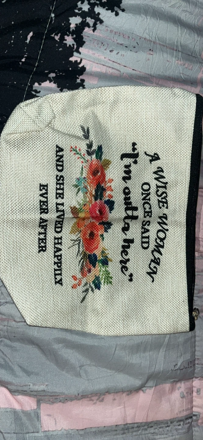 This zippered pouch features a charming floral arrangement. It's printed with the quote "A wise woman once said 'I'm outta here' and she lived happily ever after.". Made from durable linen-like material.