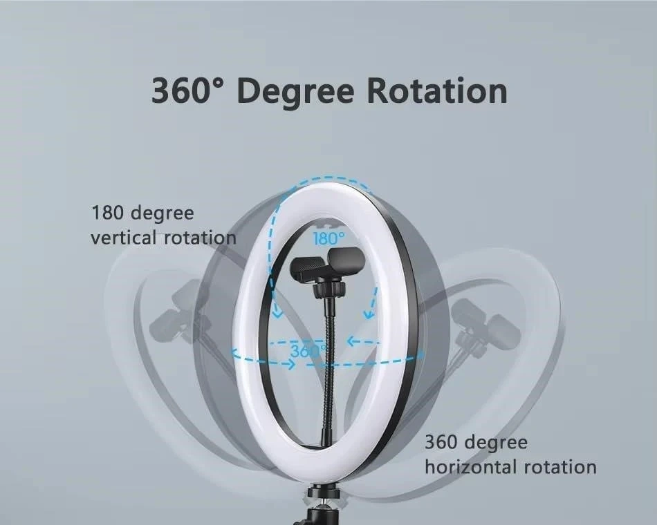 This LED ring light comes with a phone holder for easy setup. It's perfect for selfies, live broadcasting, and lighting needs. The light offers 360-degree rotation, both horizontally and vertically, for versatile positioning.